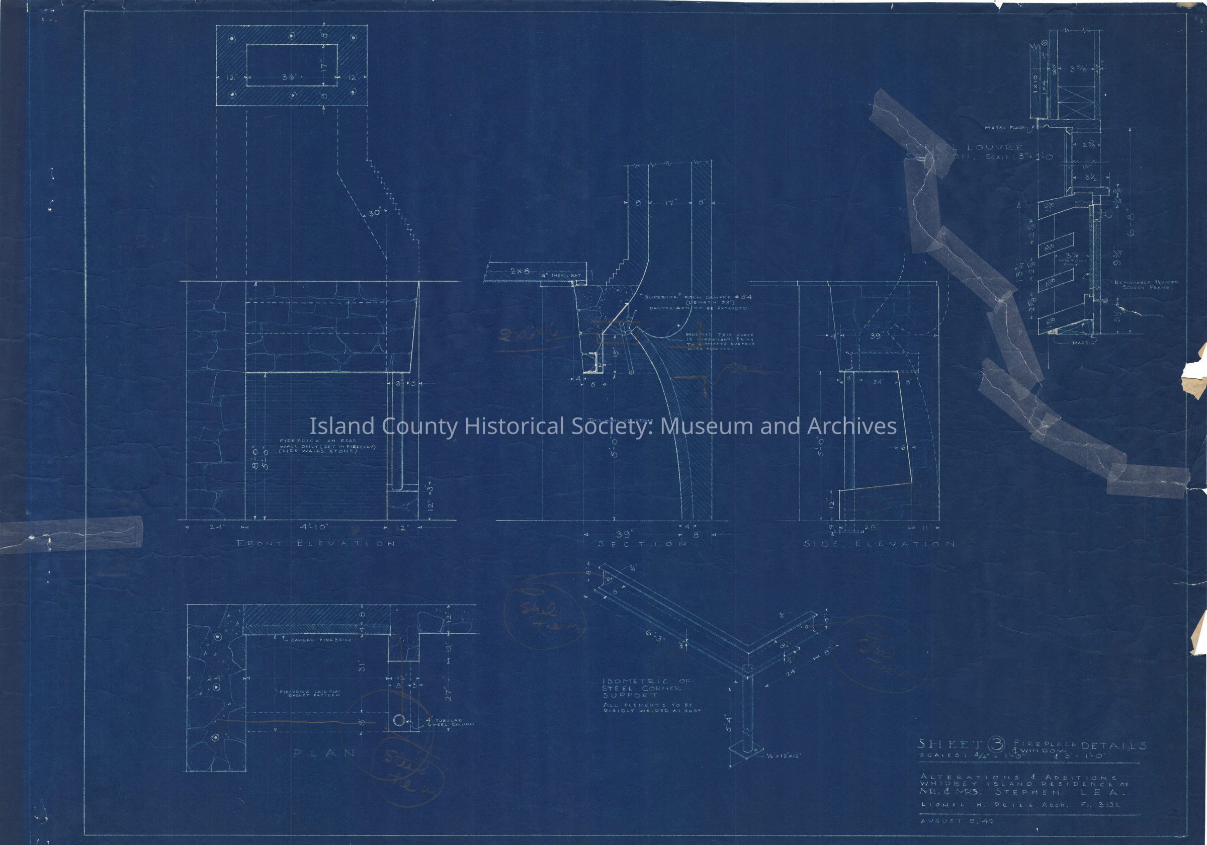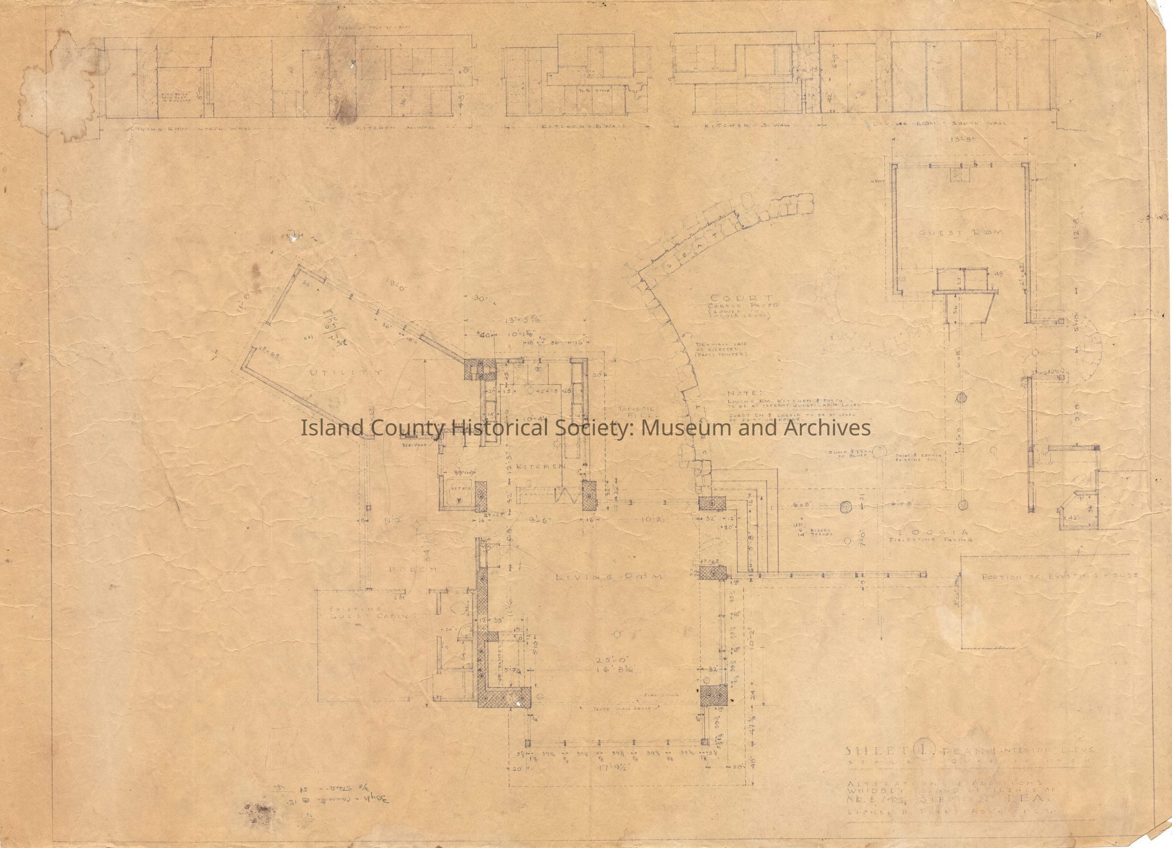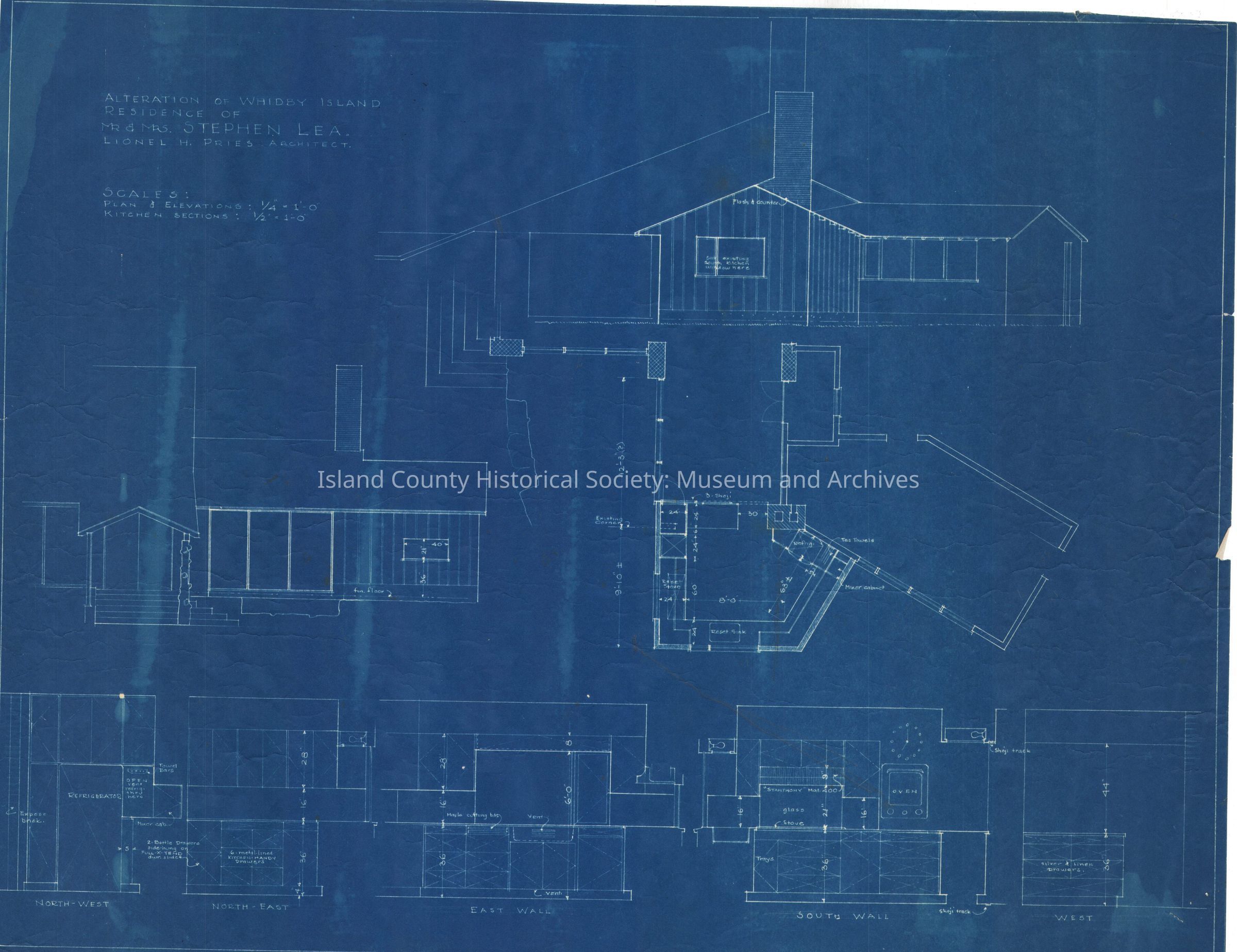 A collection of architectural drawings of the Lea building on the Robertson land claim, drawn by Lionel Pries