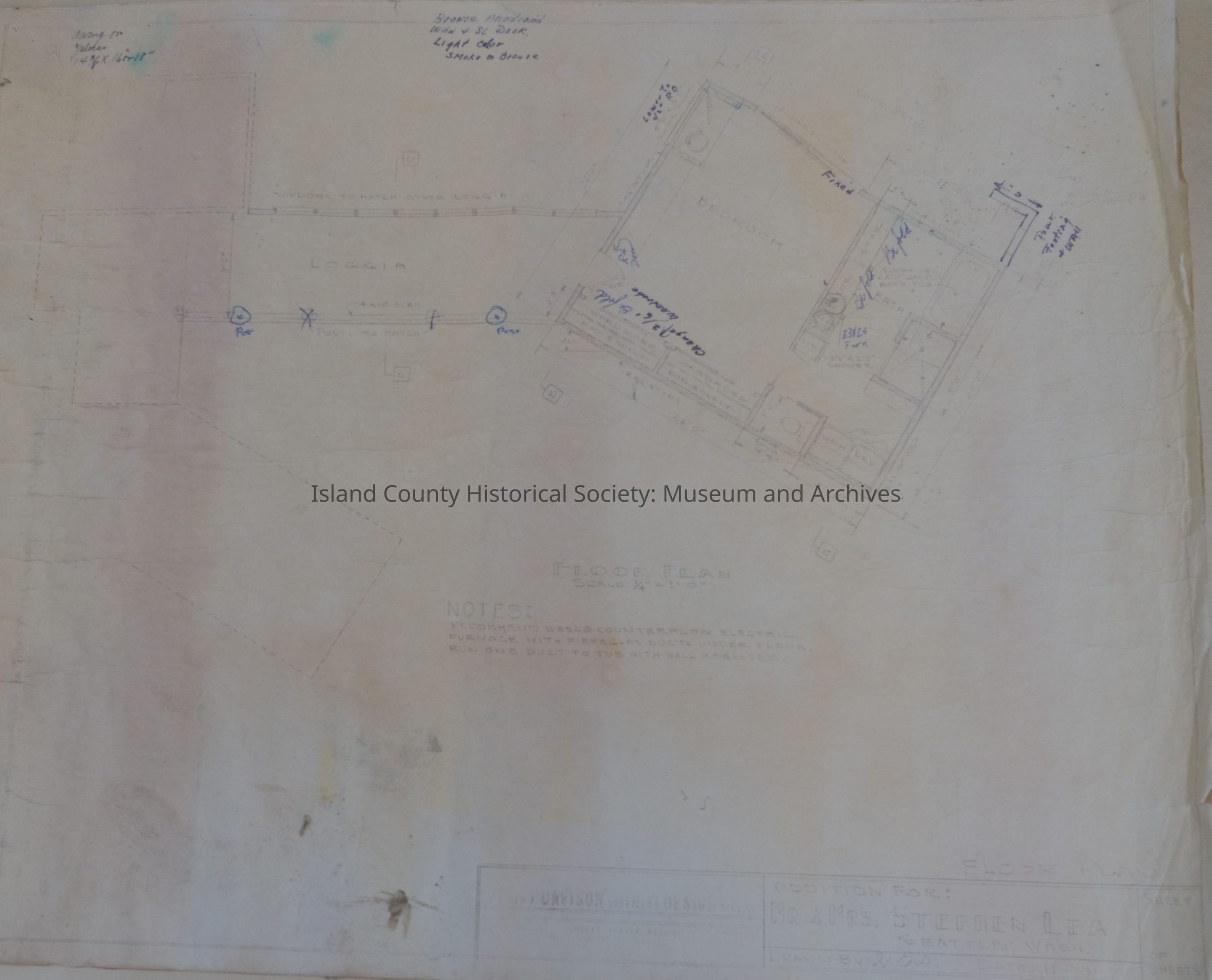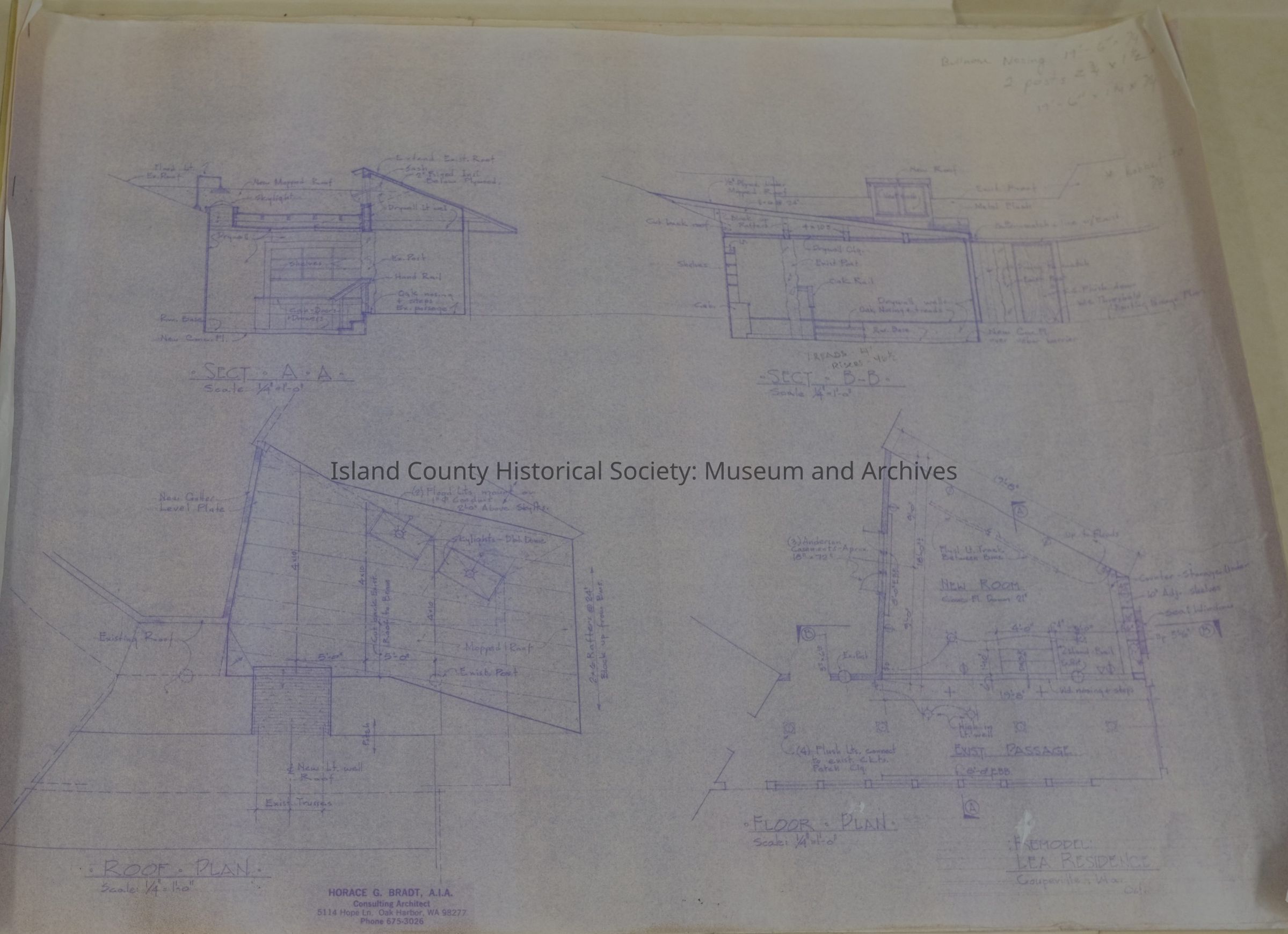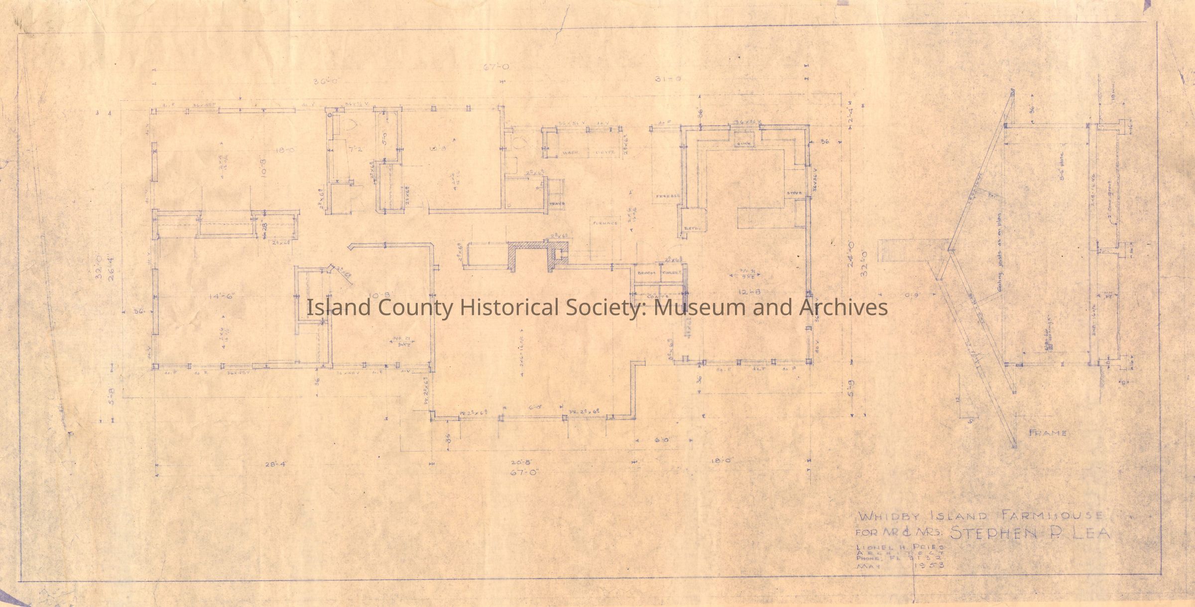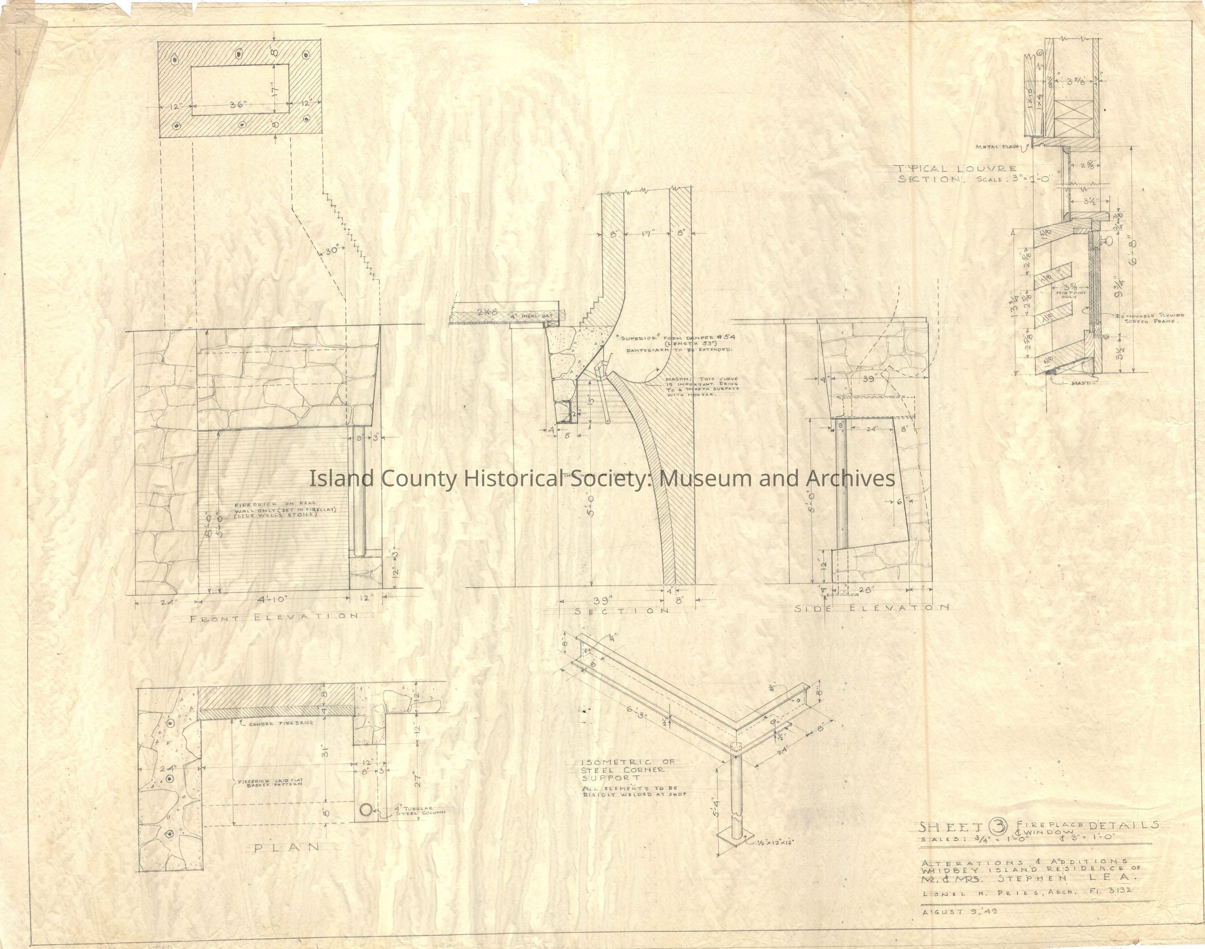 A collection of architectural drawings of the Lea building on the Robertson land claim, drawn by Lionel Pries