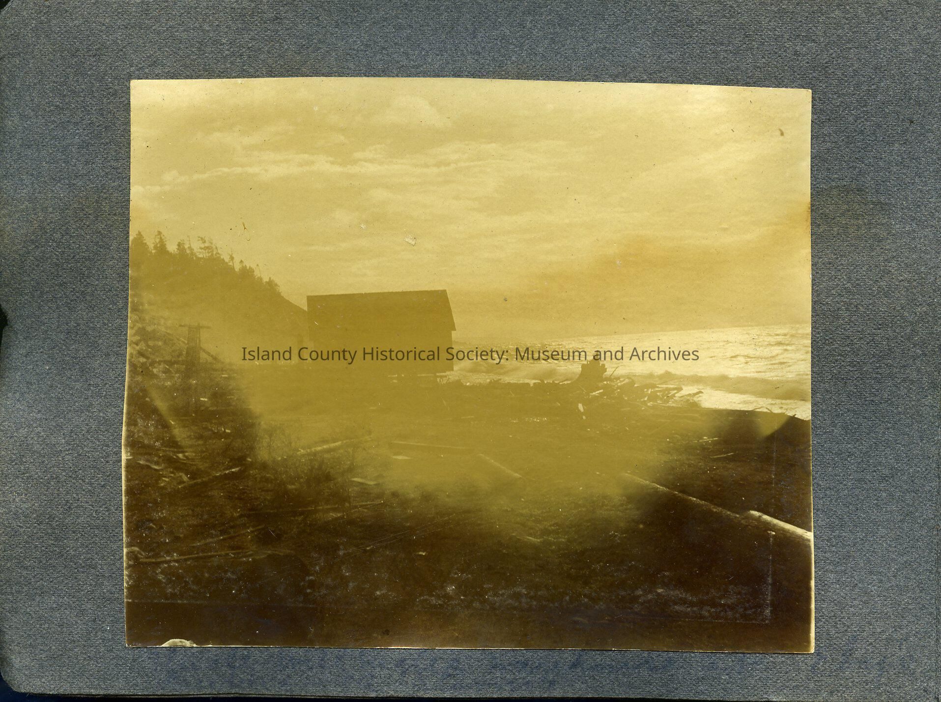 E. J. Hancock's warehouse at Ebey's Landing in a storm. High waves. Building appears tipped.