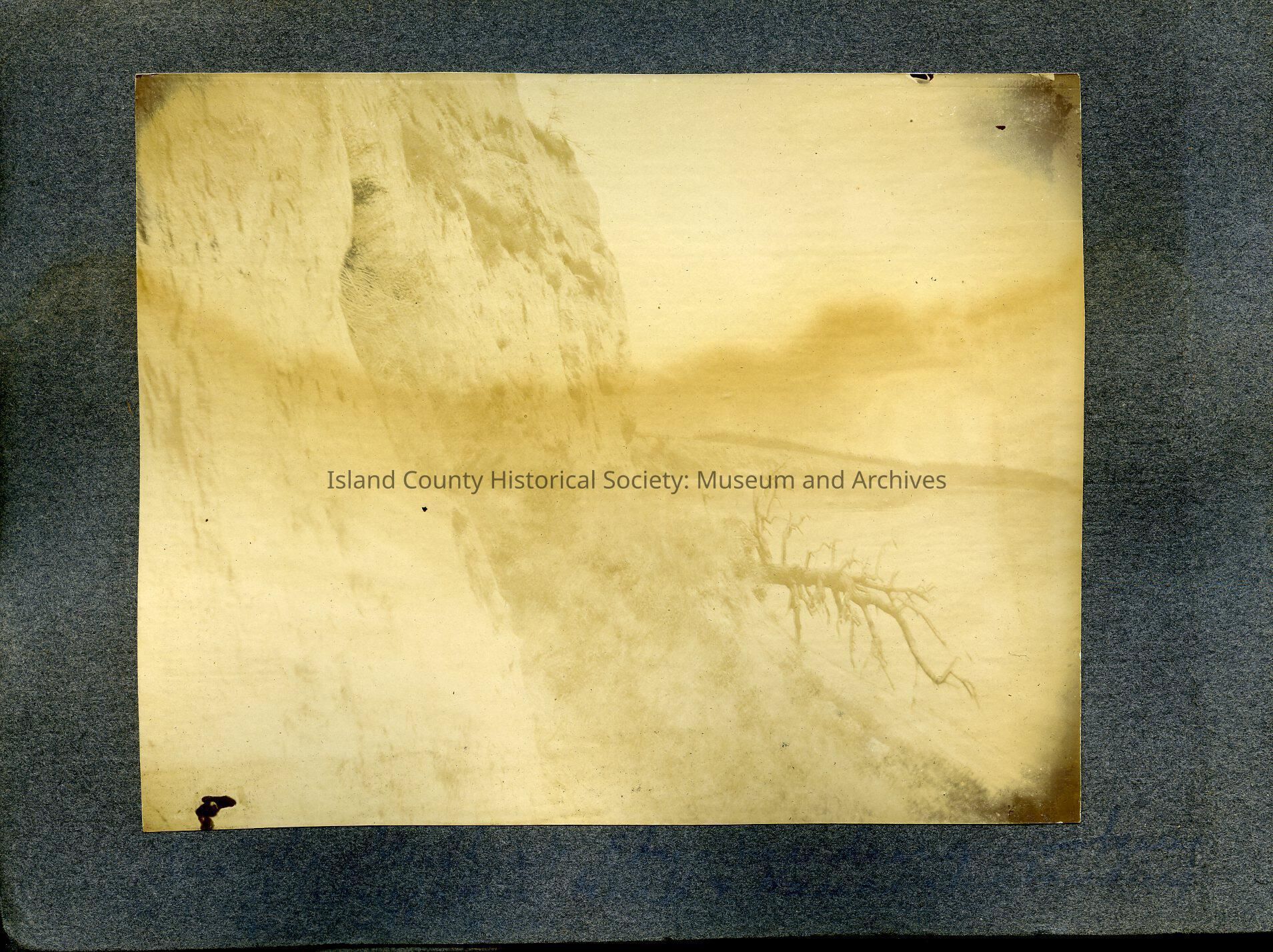Steep bluff with dead tree partially fallen and shoreline behind.