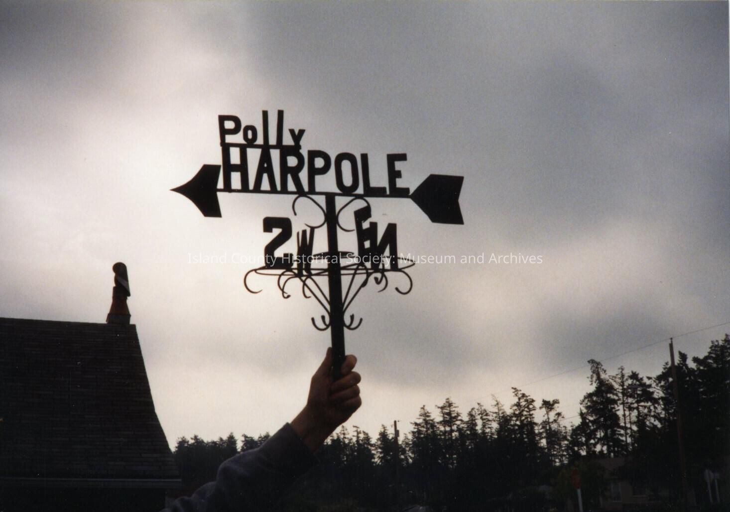 Unidentified person holding a weather vane with directions, arrow and name "Polly Harpole"