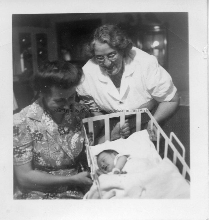 Two unidentified woman standing over an unidentified baby.