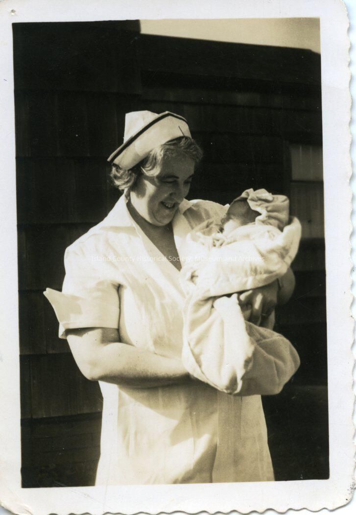 Sara Jean Sherman born Feb 6th 1944, held by an unidentifiied female nurse.