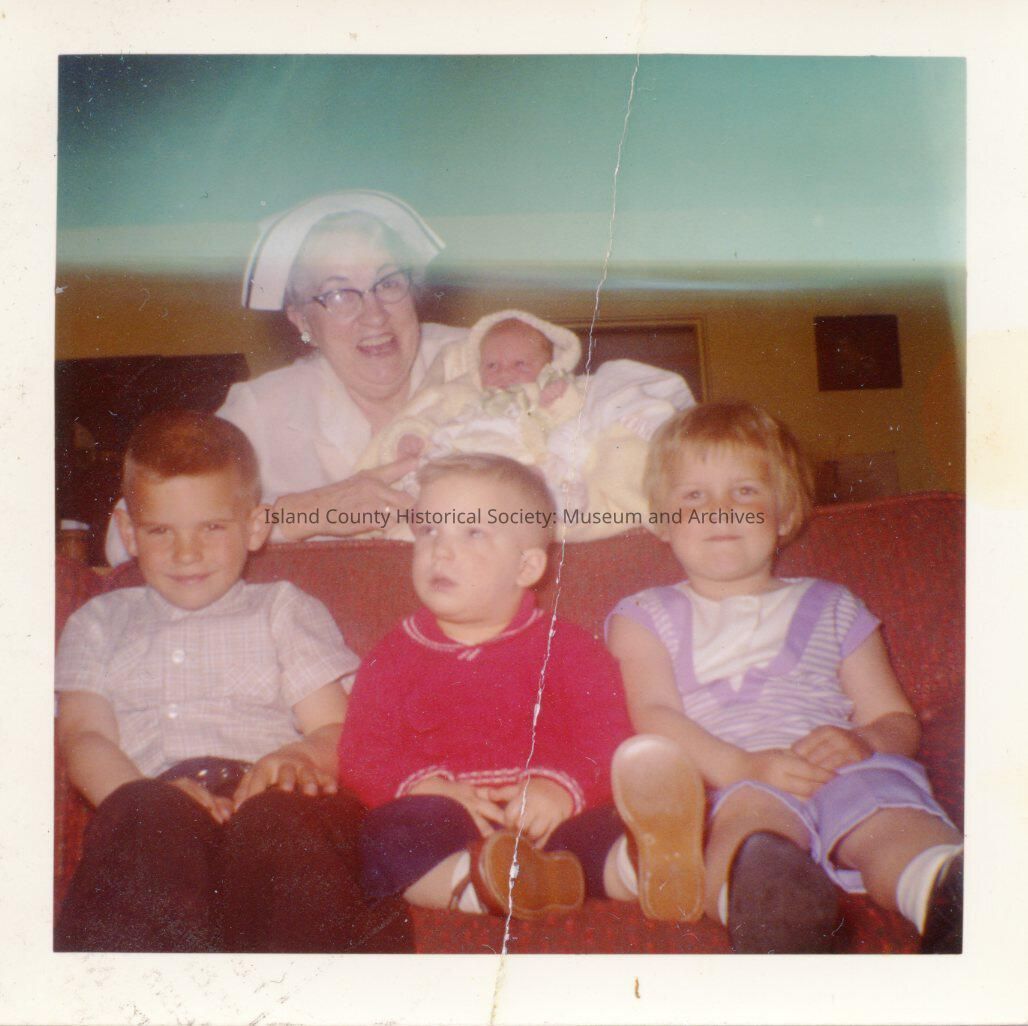 A group photo of unidentified people, a nurse holding a newborn baby in the background and three children in the foreground.