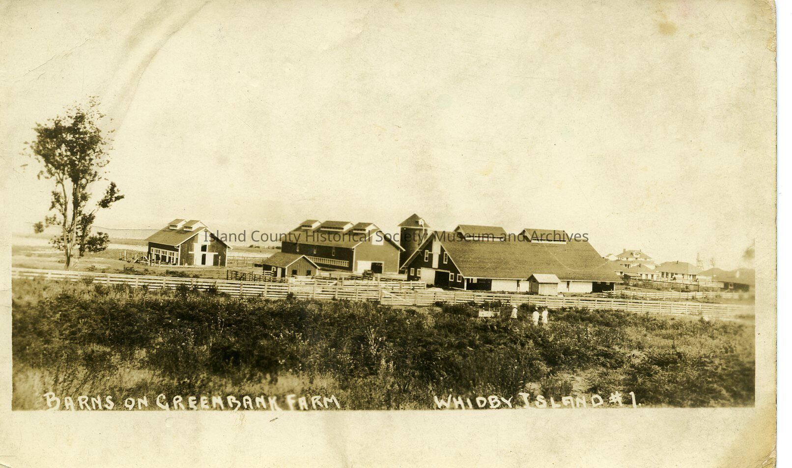 Written on the front of the postcard. "Barns on Greenbank Farm. Whidbey Island #1." Also shows silo, and other outbuildings and sheds. House in the distant background.Made/Created