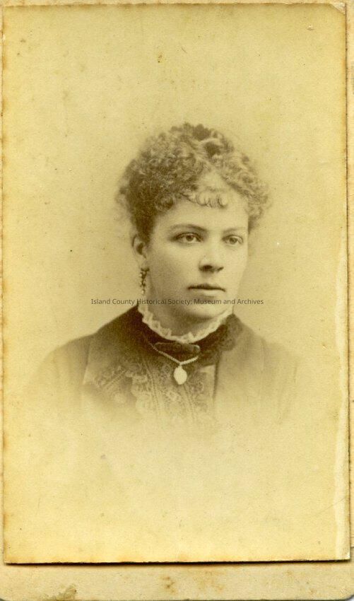 Portrait of Charlotte Haller "Lottie" wearing a dark dress and a curly hairstyle, she is wearing a locket. From the Swift-Race Collection.