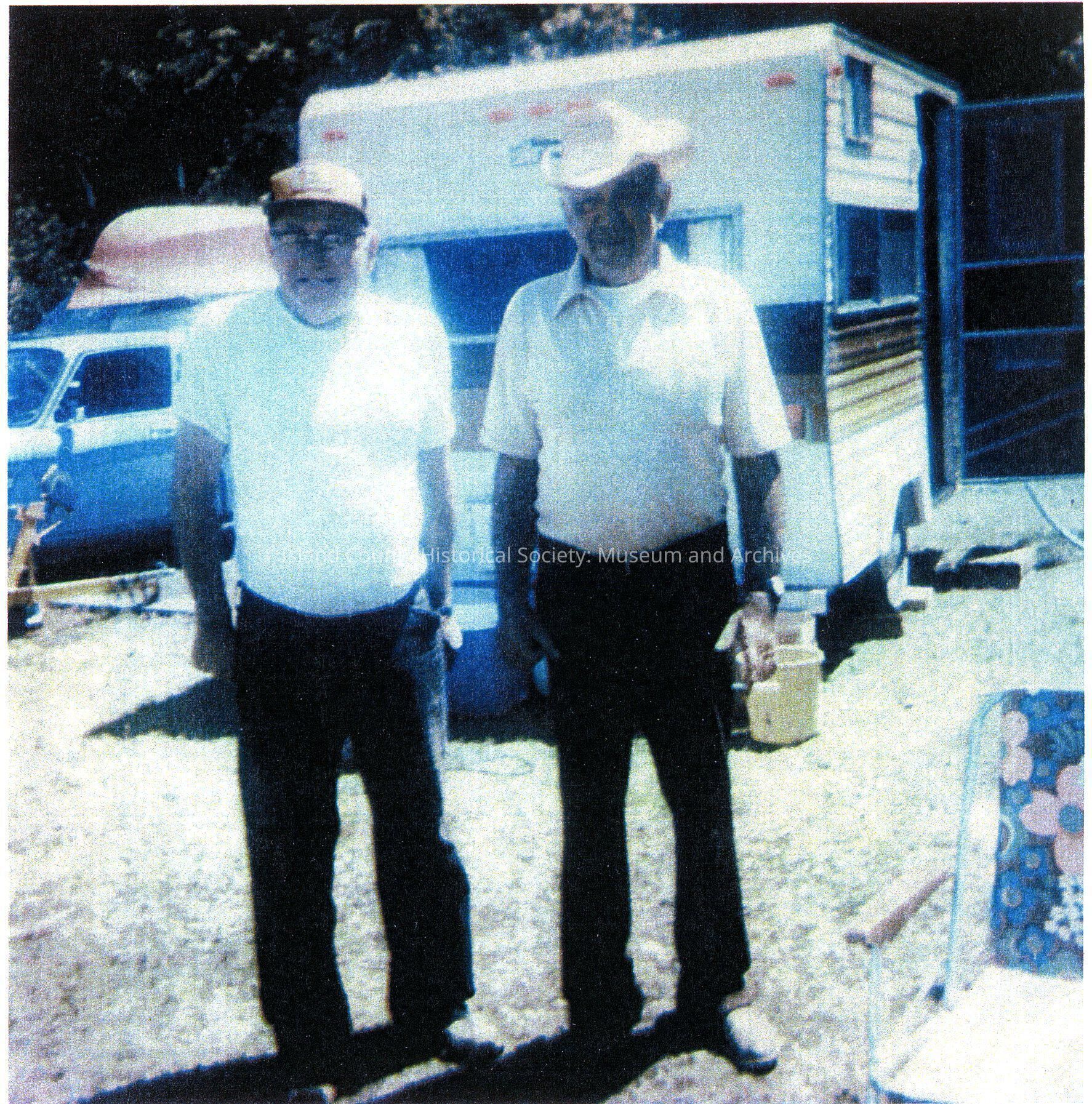 This photo pictures Ralph Edwin Smith and Edwin Smith (Ralph's younger brother). They are standing and in front of a travel trailer and on the left side there is a vehicle with a boat strapped to the top. In the right - lower hand corner of the picture there is a floral beach chair. This photo is a photocopy.