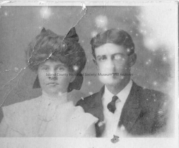 Portrait of Athaleen and Leslie Harrington, Leslie has a very large pulled up hairstyle; Atherton is wearing a suit.