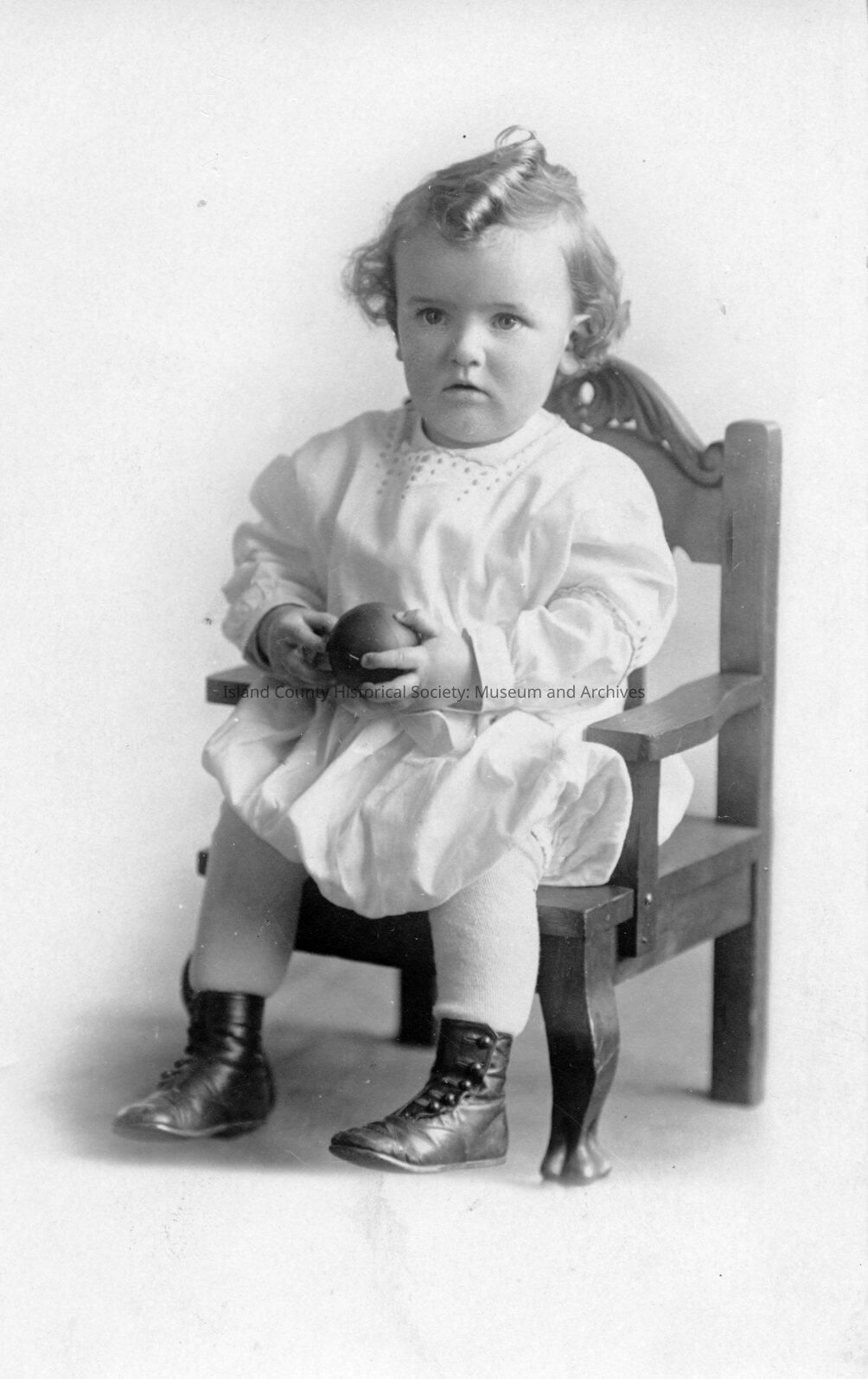Portrait of Robert L. Hartley at 16months old. He is wearing a white dress and little black boots. He is seated in a child's chair and is holding a ball. On the back: Christmas Greetings Rev. & Mrs. R. C. Hartley"