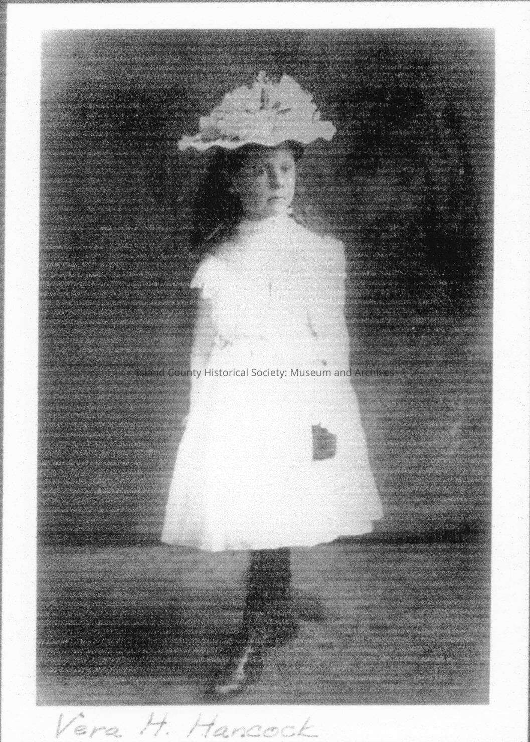 Portrait of Vera H. Hancock as a child wearing a white dress and a hat.Made/Created