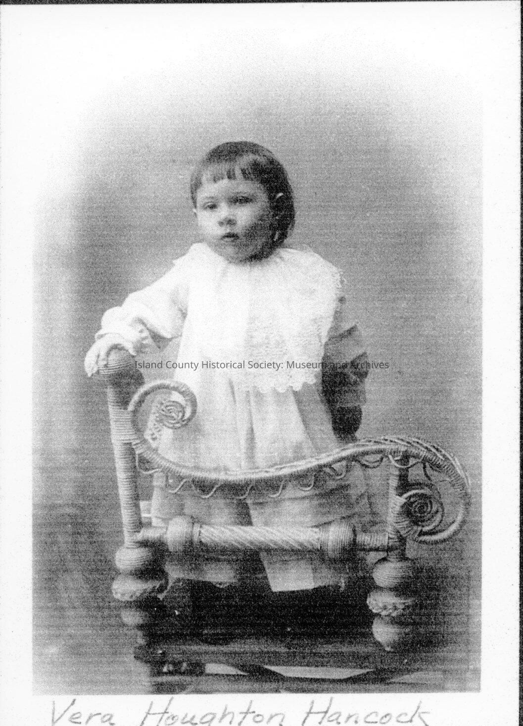 Portrait of Vera Hancock in a white dress standing on a wicker chair.Made/Created