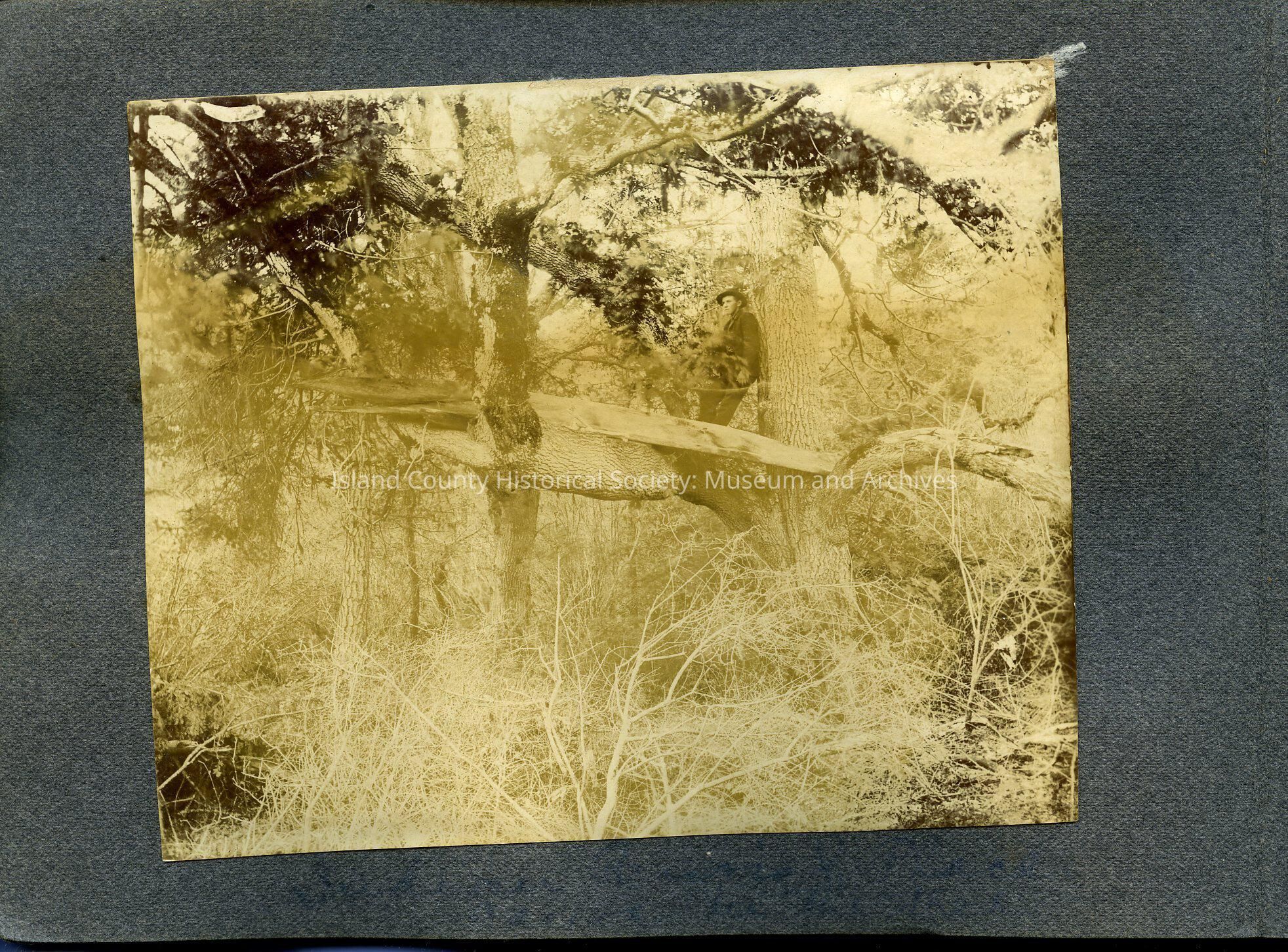 Indian burial canoe at San de Fuca. It stretches across large limbs of a spreading tree. A man is in the tree looking at it.