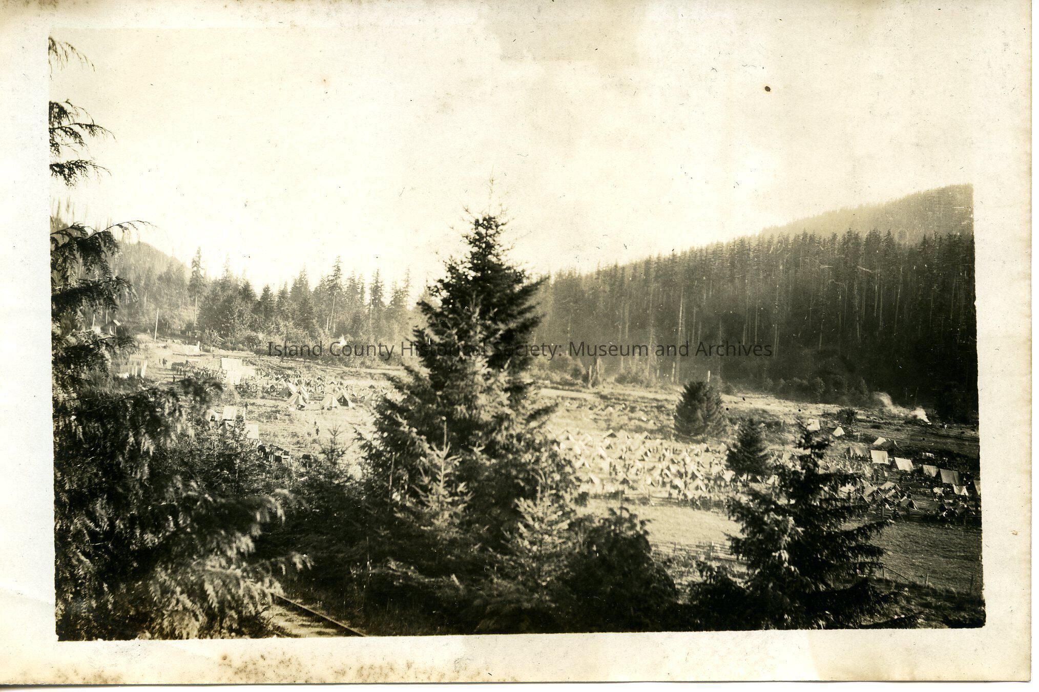 Military camp. On the front of the photo it states unidentified camp. Shows multiple tents set up in military style. Railroad track in lower left of the photo. Large timber line surrounding the camp site.