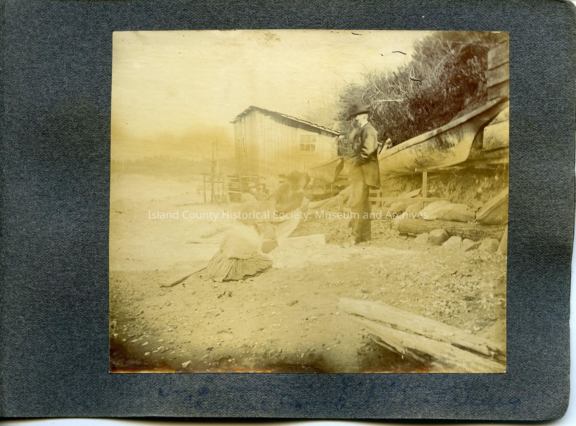 Indian making a canoe on a beach in front of a small building. He sits in the canoe; finished canoes are on racks at edge of beach. Professor Newberry stands watching him work.