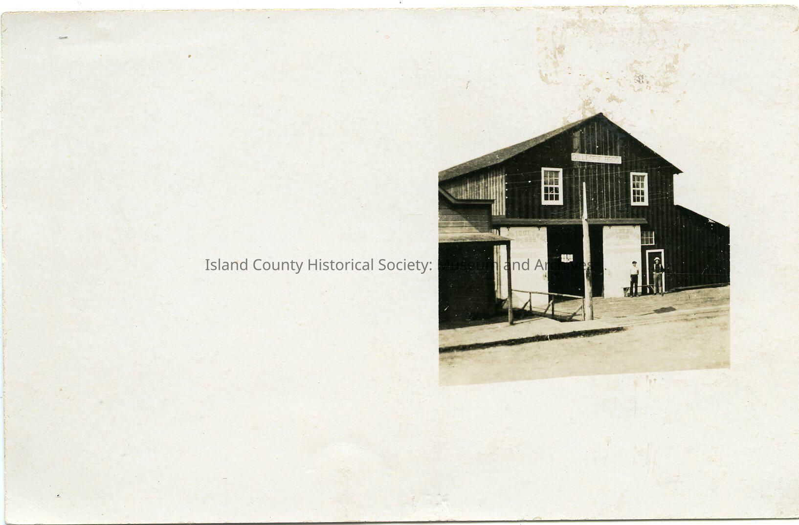 Postcard of the building at 22 NW Front Street. It is a two-story building with two large stable barn doors that slide open from the middle. Two windows are on second floor and a small window and door are on the right. Two men are in front of the building. A sign at the top: Gillespie Bro. Signs on both doors: Agricultural Users. Might be a wood sidewalk on the left and a dirt road in front.-