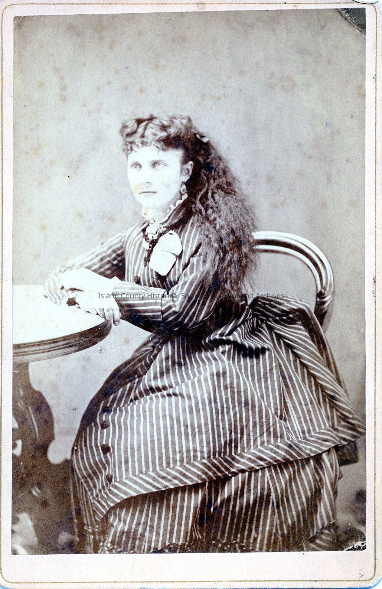 Portrait of Mary (Mollie) Coupe Jones seated at a table wearing a stripped dress. 1875. Mary Ellen (Mollie) Coupe Jones from Coupe family album #14.