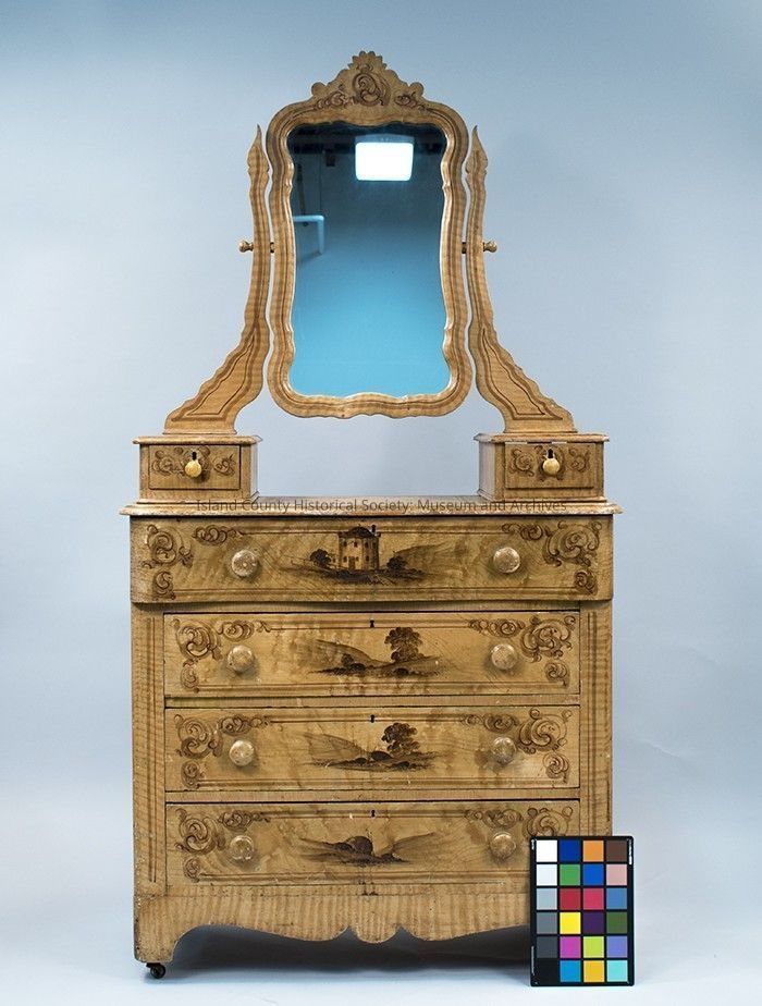 From MOHAI Catalog Card: Pine, dresser hand painted with wavy lines and pastoral scenes. 4 large drawers, two side drawers on top, and adjustable mirror on wooden bracket. Pumpkin pine, so called by its golden color. Dresser brought around the Horn in the early 1850s by Captain Coupe founder of Coupeville, Whidbey Island.Lexicon