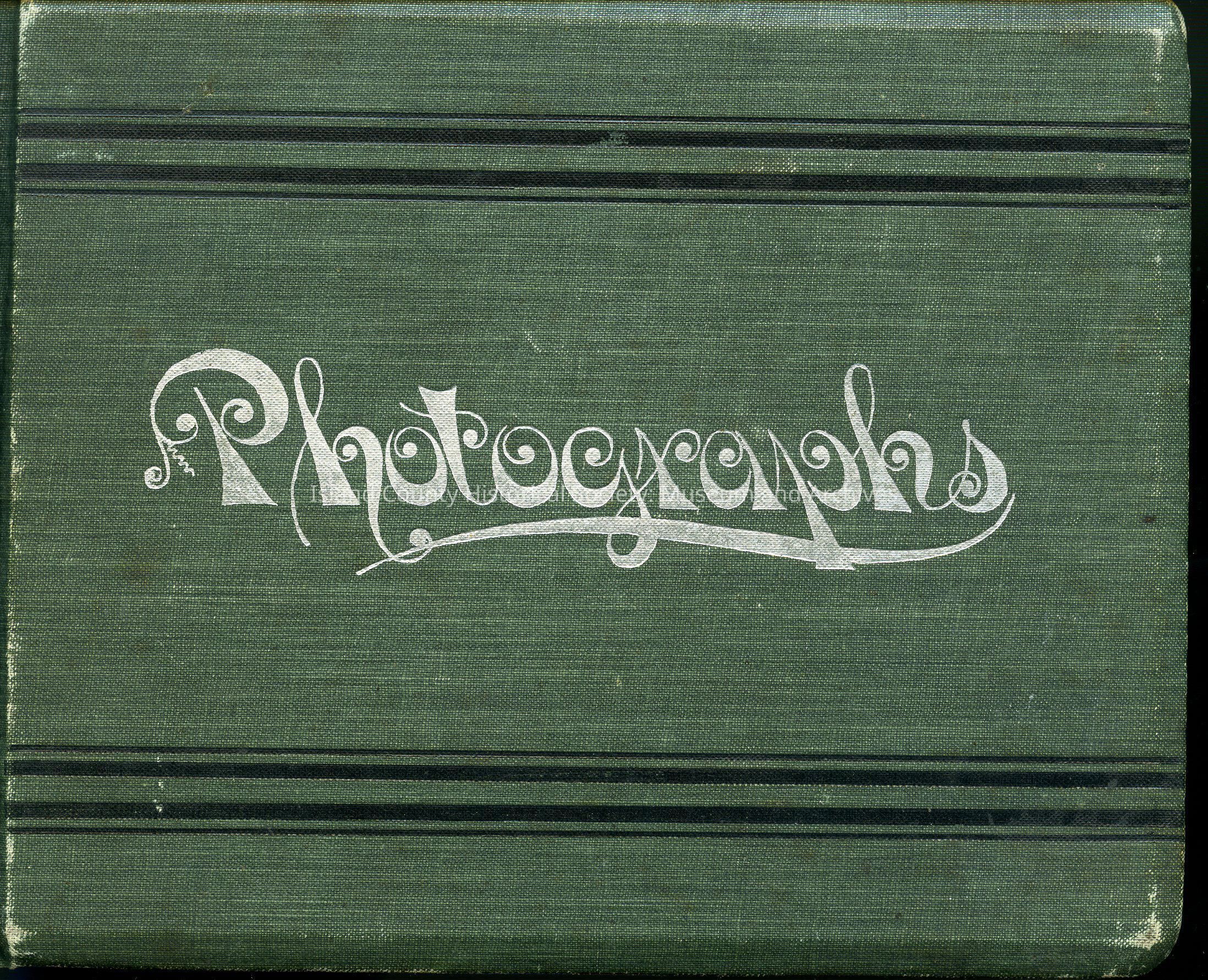 Engle Photo album of scenes. This album is 6 x 7.5 size and has a green back and front cover. Inside photo album front is a note that reads: 315 Island Co. Historical Society 1900-
