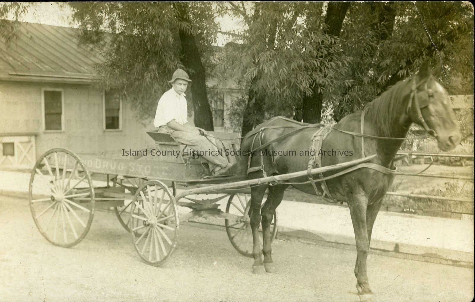 Postcard depicting a horse-drawn goods wagon with "Island Drug Store" painted on the side. Likely c. 1900-1920.