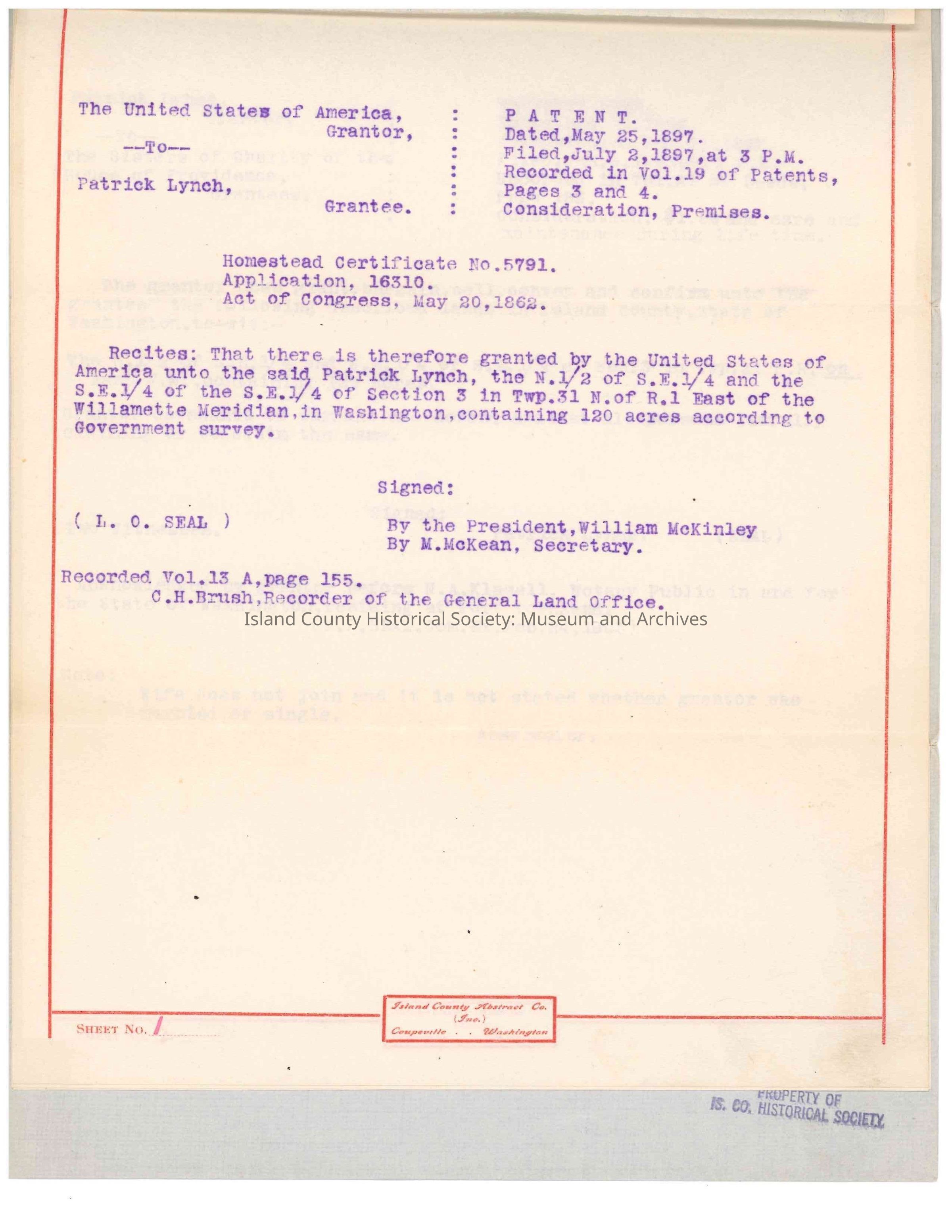 Abstract of Title for a portion of land on Whidbey Island, granted to Patrick Lynch by the United States of America, consisting of a total of 120 acres. Dated 25 May 1897.