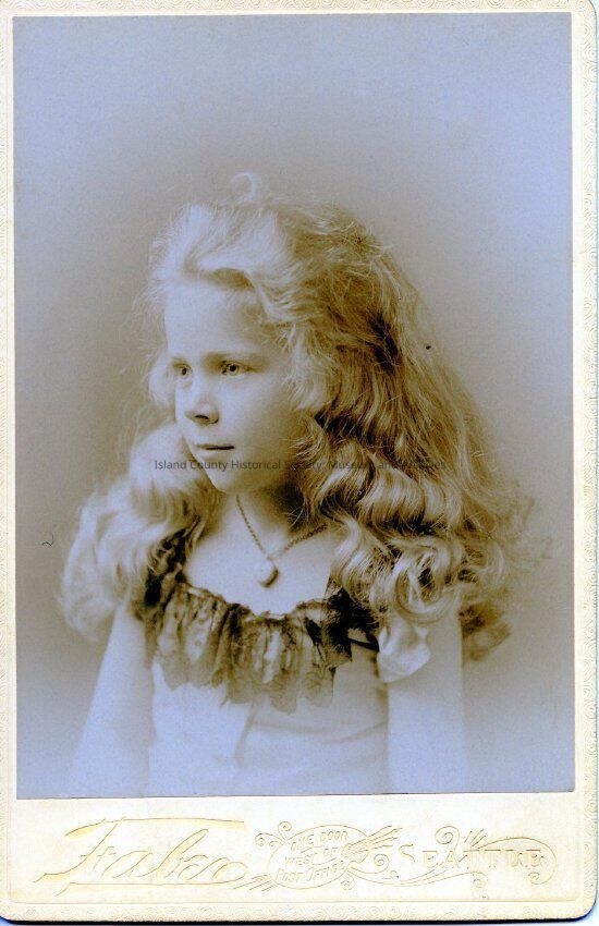 Portrait of Leah Jones wearing a dress and a necklace with a heart charm. She has long curly light colored hair. Leah Jones, Mary's daughter.