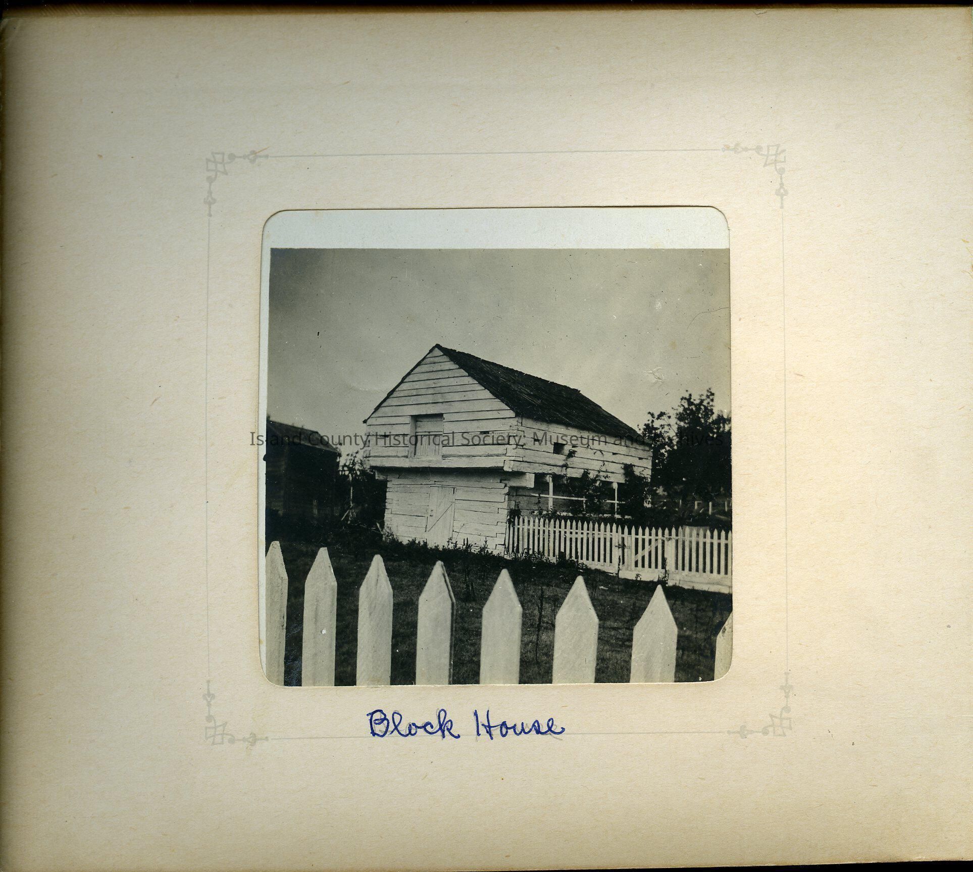 Alexander blockhouse with picket fences. Building is visible to left. Trellis to second floor has vines climbing it. Note reads: Block House.