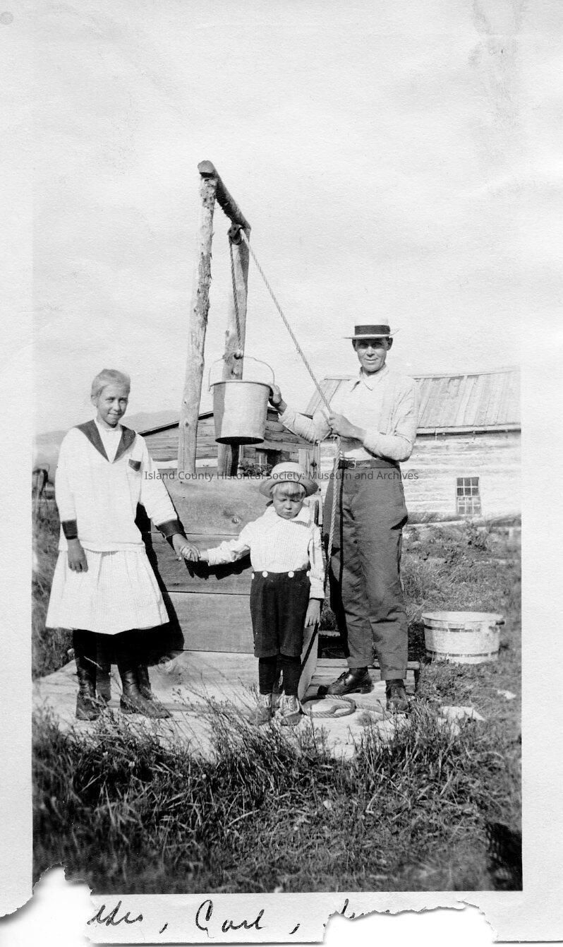 Family photo of the Johnson family standing next to a well. Carl Johnson is pictured in the center as a young boy.