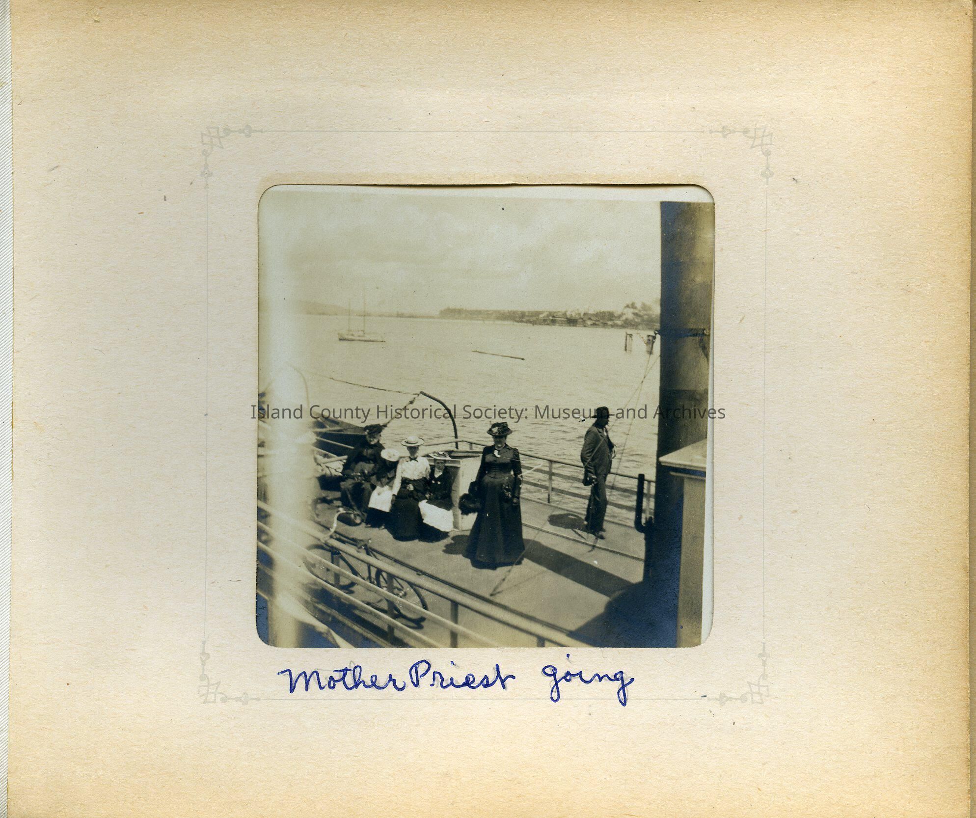 Deck of a steamer. A woman stands. A family is seated on bench and a man stands at rail. Bicycle leans on rail. Tall chimney on right. Other boats and shoreline in background. Note reads: Mother Priest going.