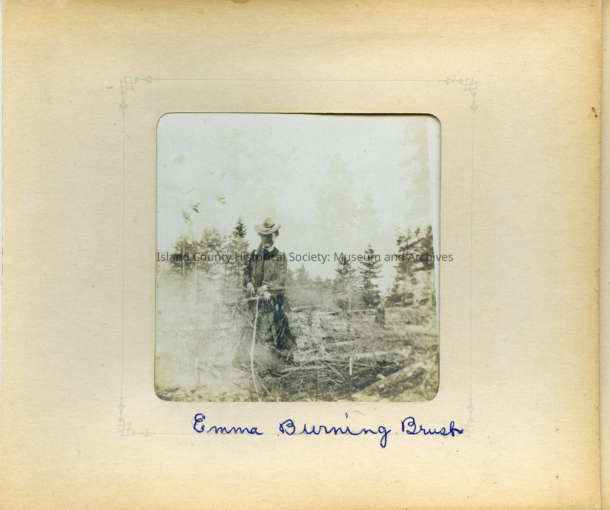 A woman stands in a logged area behind a fire. She holds branches. Note reads: Emma Burning Brush.