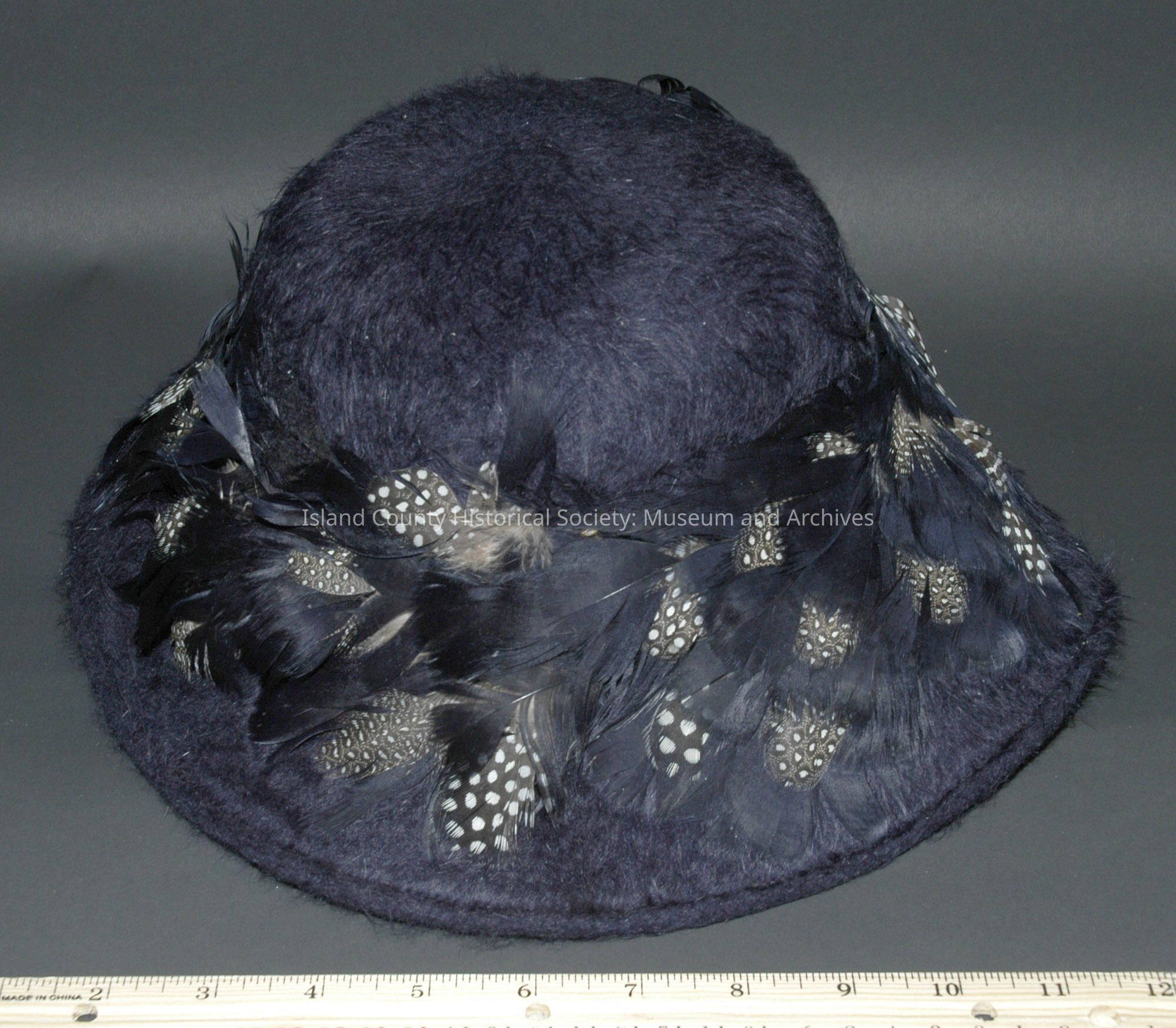 Navy fur felt - with Navy & spotted feathers around brim and black pin, "Jaevar" Frederick & Nelson, 1950's.