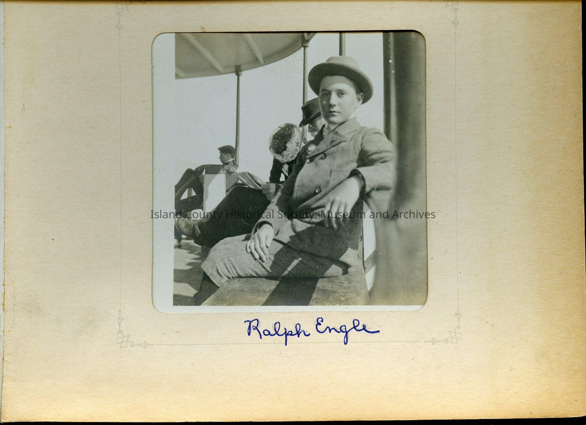 Closeup of boy seated on steamer Fairhaven. Man and woman and another man in background. He wears short pants and stockings, a wool jacket and hat. Note reads: Ralph Engle.Lexicon