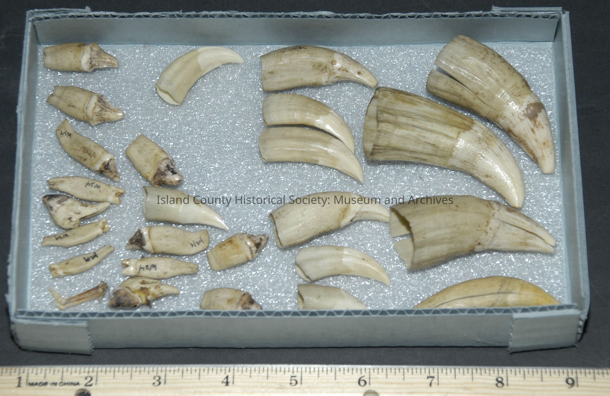 Assortment of animal teeth and tusks (in basket W23) Likely from orcas, most specifically the subspecies resident orcas.