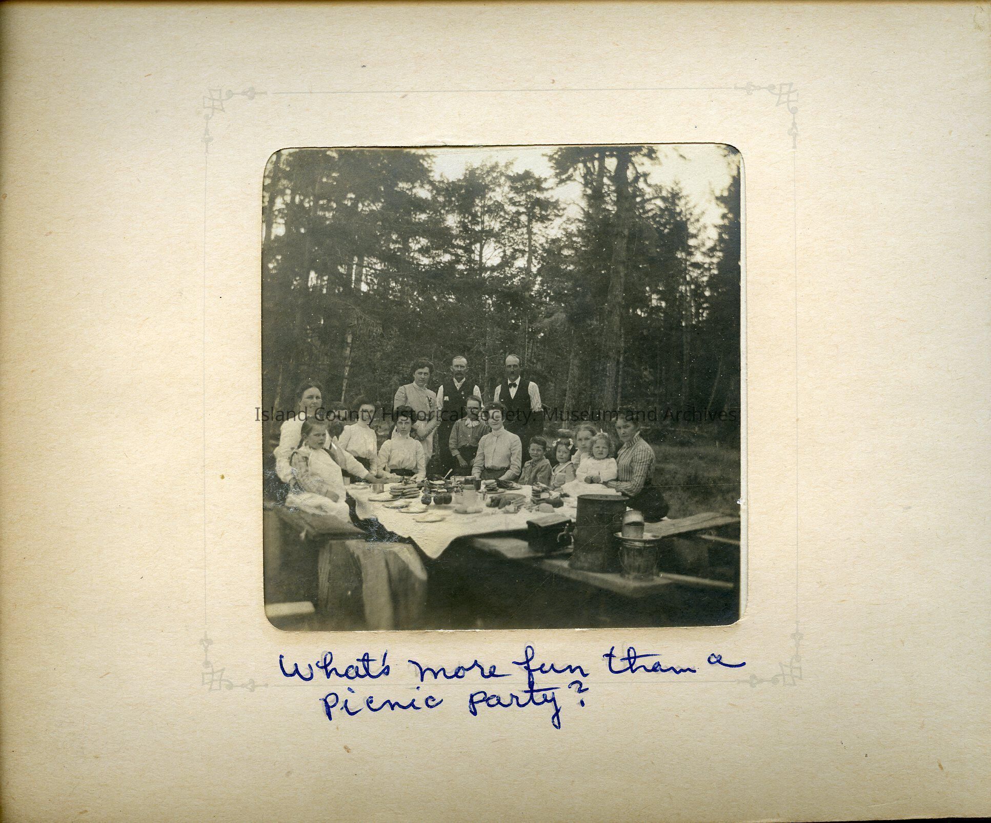 A large group of men, women, and children surround a table laden with food in an outdoor setting. The table is on large rough planks sett on logs. Seats are logs and planks. Trees in background. Note reads: What's more fun than a picnic party?