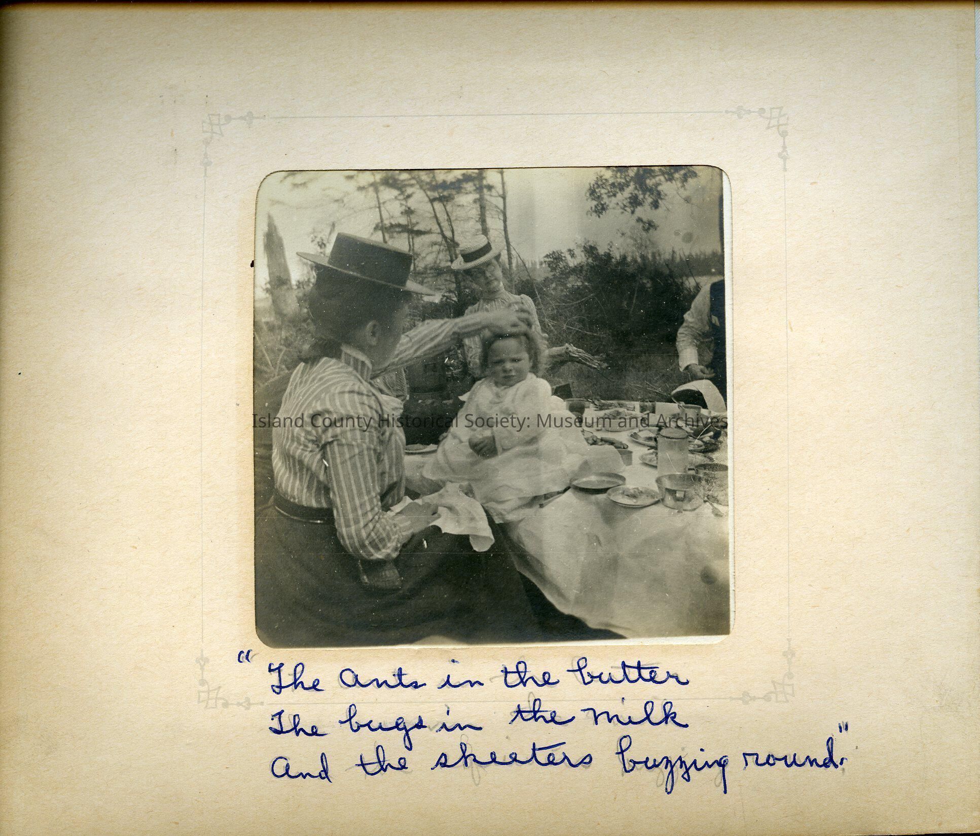 Three women at a picnic table. A small unhappy-looking child sits on the table with a woman's hand on her head. Note reads: "The ants in the butter, the bugs in the milk and the skeeters buzzing round."