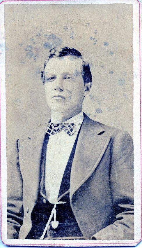 Portrait of Jacob Jenne seated wearing a suit and bowtie, hanging off his vest is a small charm in the shape of a shovel. On the back is number 179; the accession book states this is unknown man age 30.