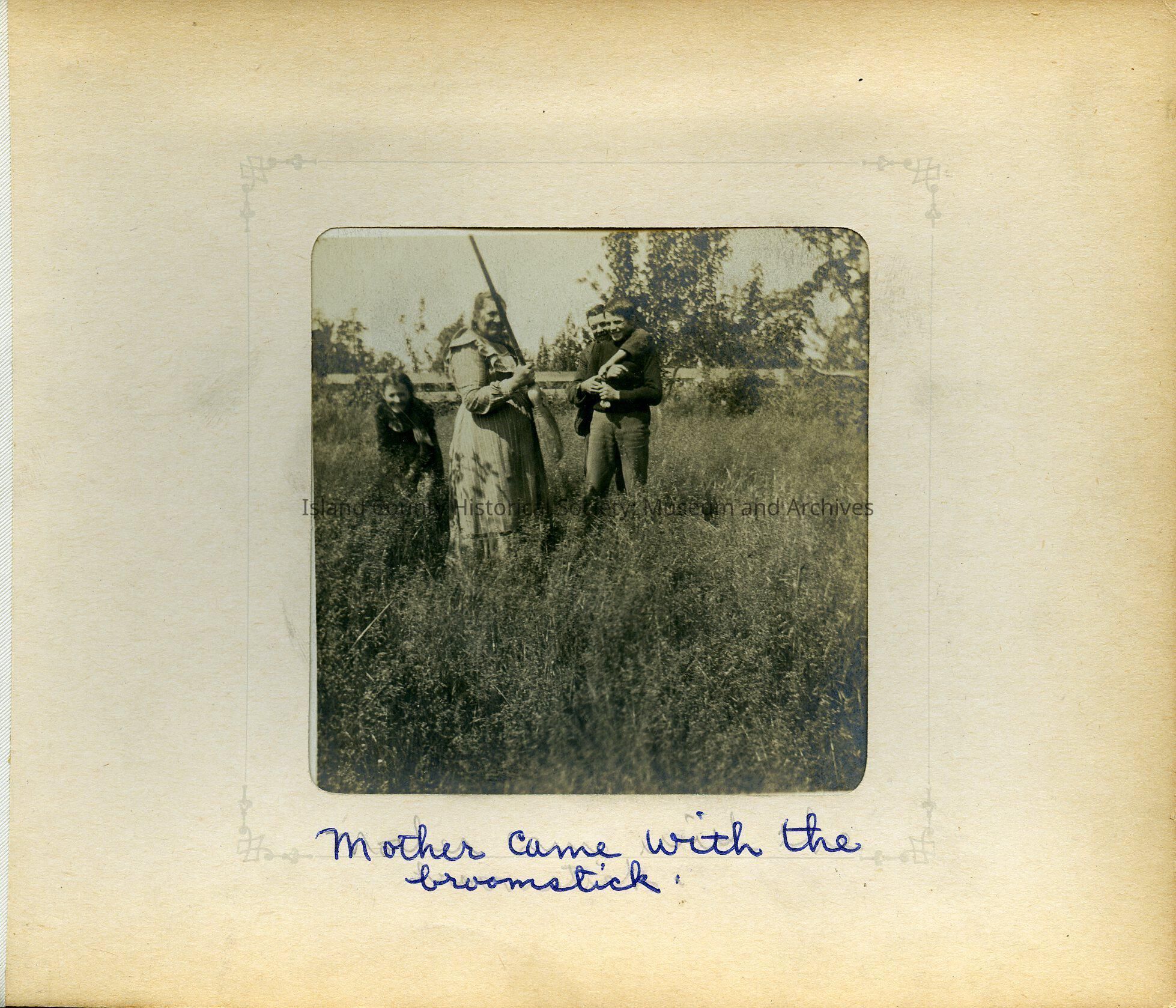 A man with arm around a boy's neck. Girl is to the side of a woman with a broom. They are in a field with fence in background. Note reads: Mother came with broomstick.