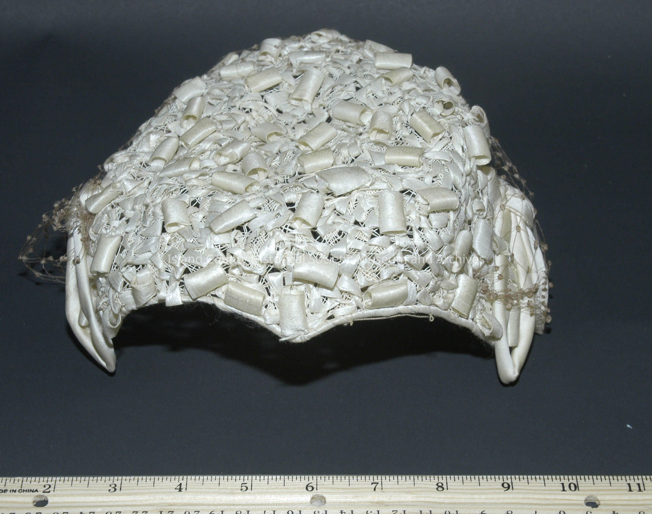 White lace straw hat with ribbin rolls and flower, 71/2 inch diameter. Made by Frederick and Nelson.