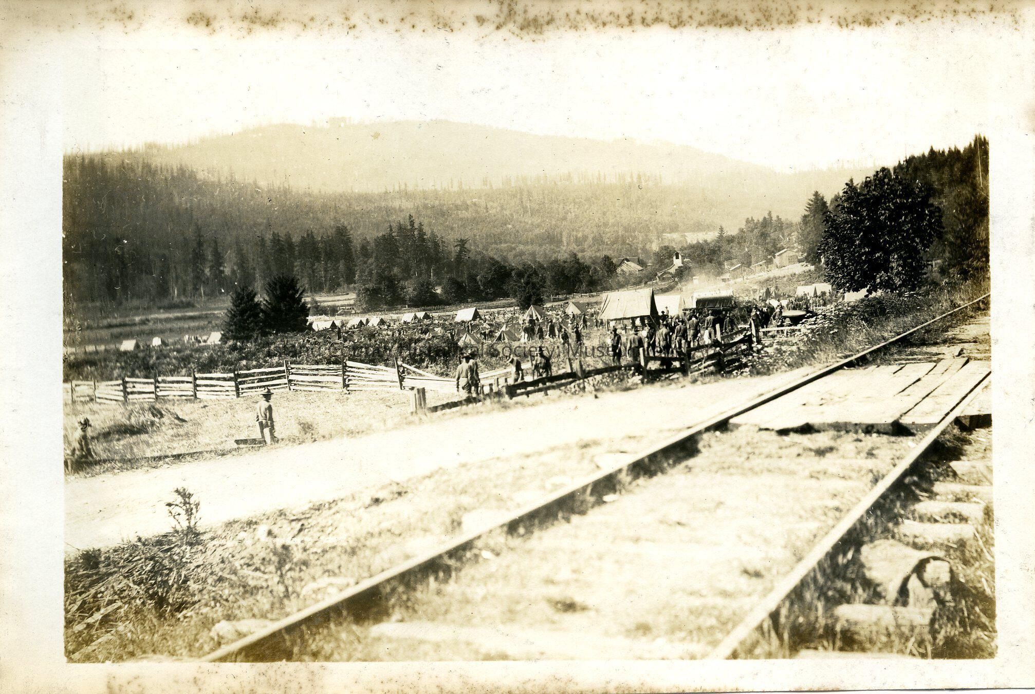 A military encampment with tents and soldiers. Camp set up next to railroad tracks. Some barns and sheds with an open pasture setting behind the camp.