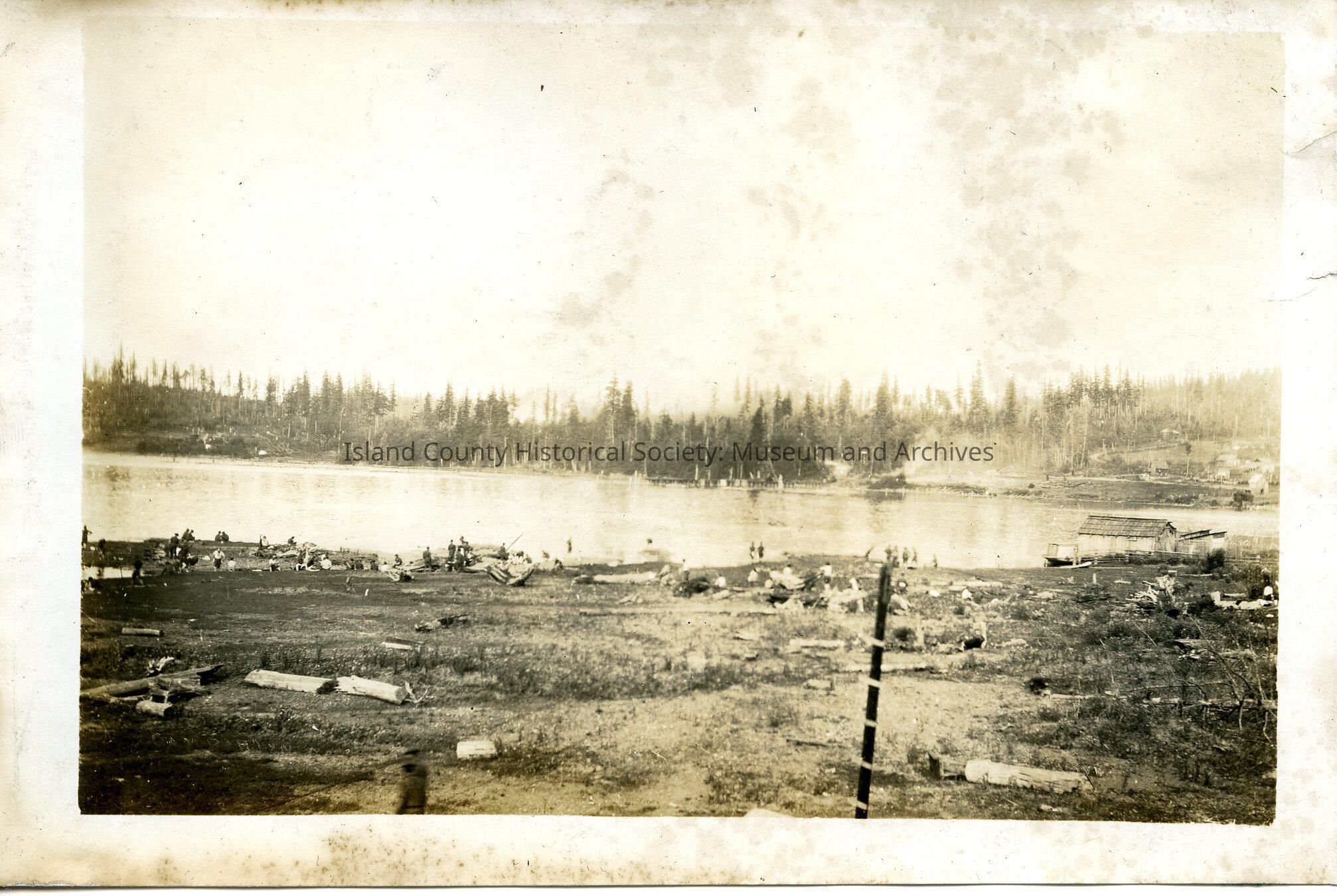 Beach and swimming area. Several people on the beach. Shows some sheds and timberline on the opposite shoreline. Person fishing on the beach.