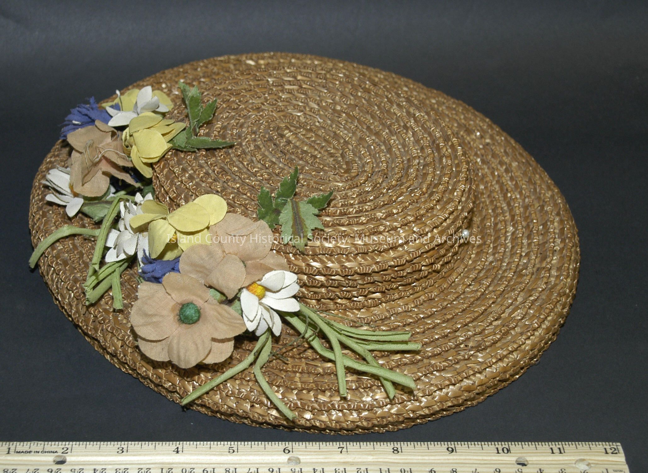 Tan straw hat with yellow, white, purple, and tan flowers, 1940's.