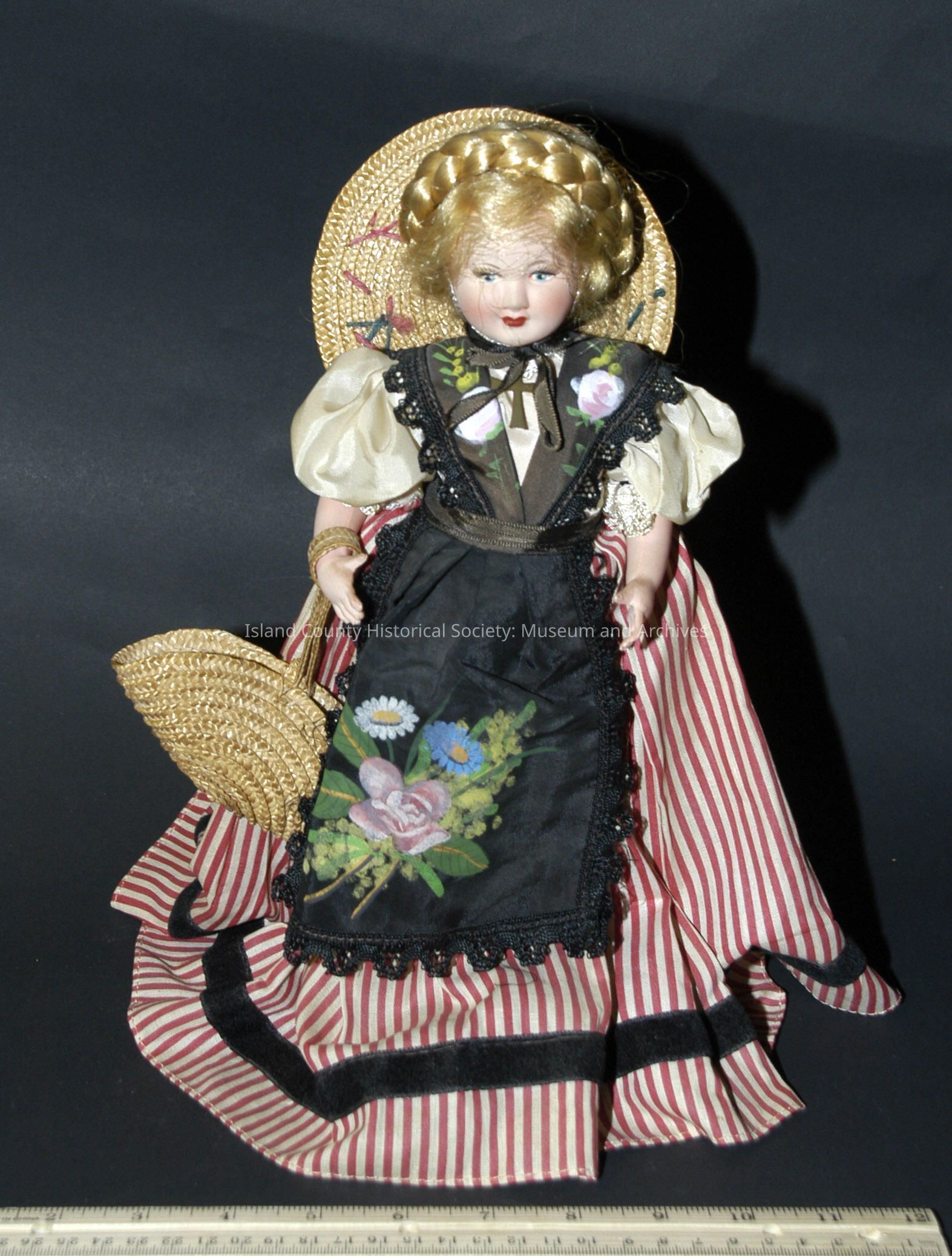 German doll with pinstripe skirt and black floral apron with wicker hat and bag.Collection