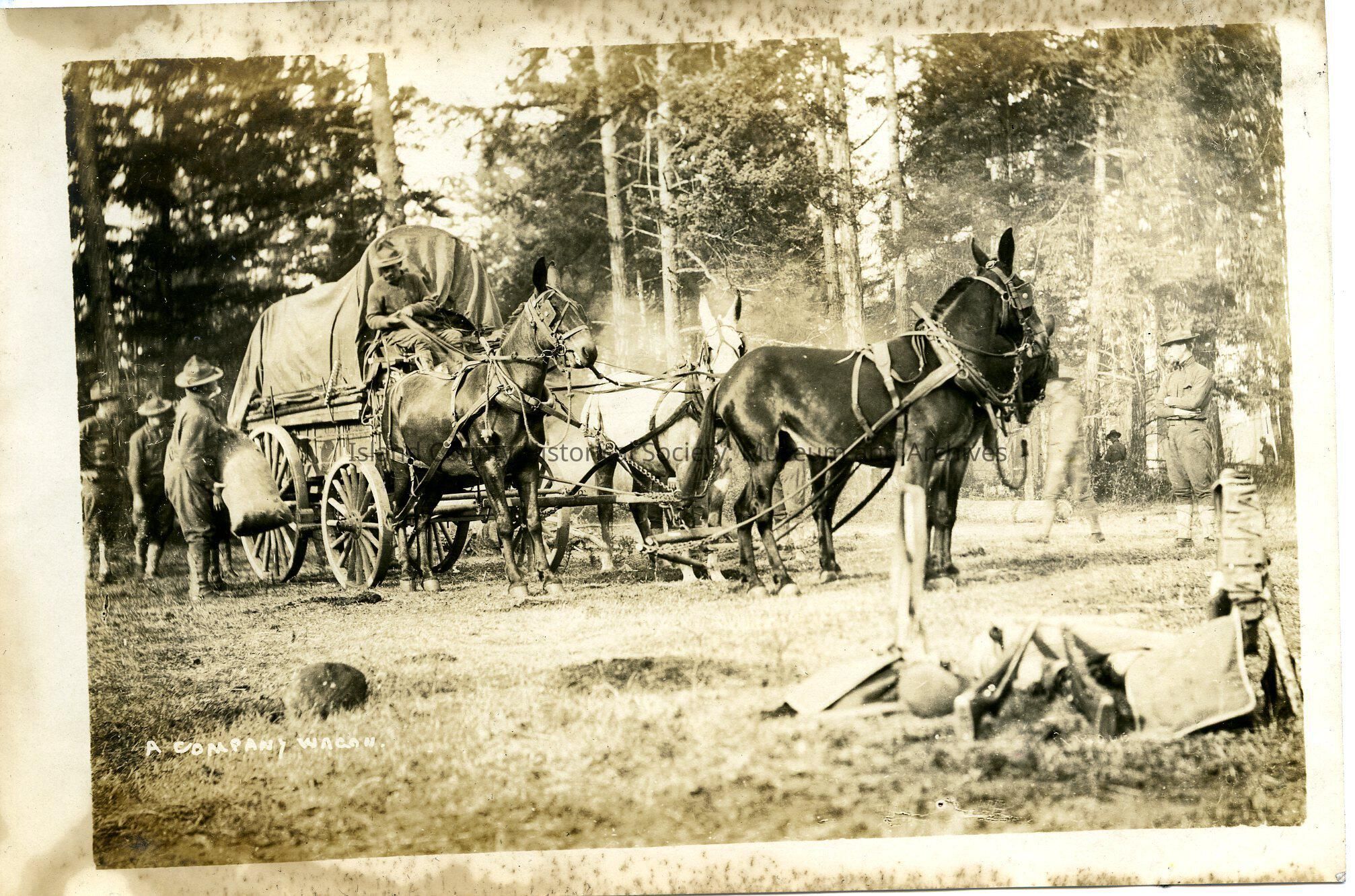 Photo states "A Company Wagon". Shows a wagon being pulled by a team of mules. Close up of harness attached to the wagon. Soldier driving the team, and soldiers at the rear of the photo. Rifles in the lower right corner with other camp gear. Soldiers loading up the wagon.