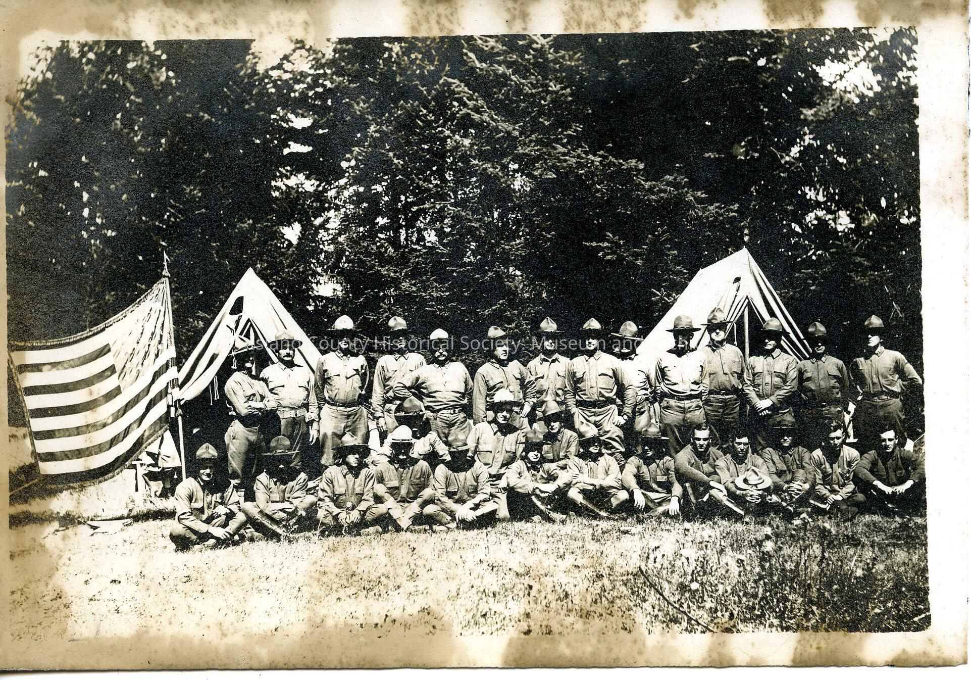 A Company of soldiers in uniform standing in a group between two tents with a flag. Back row standing front row sitting.