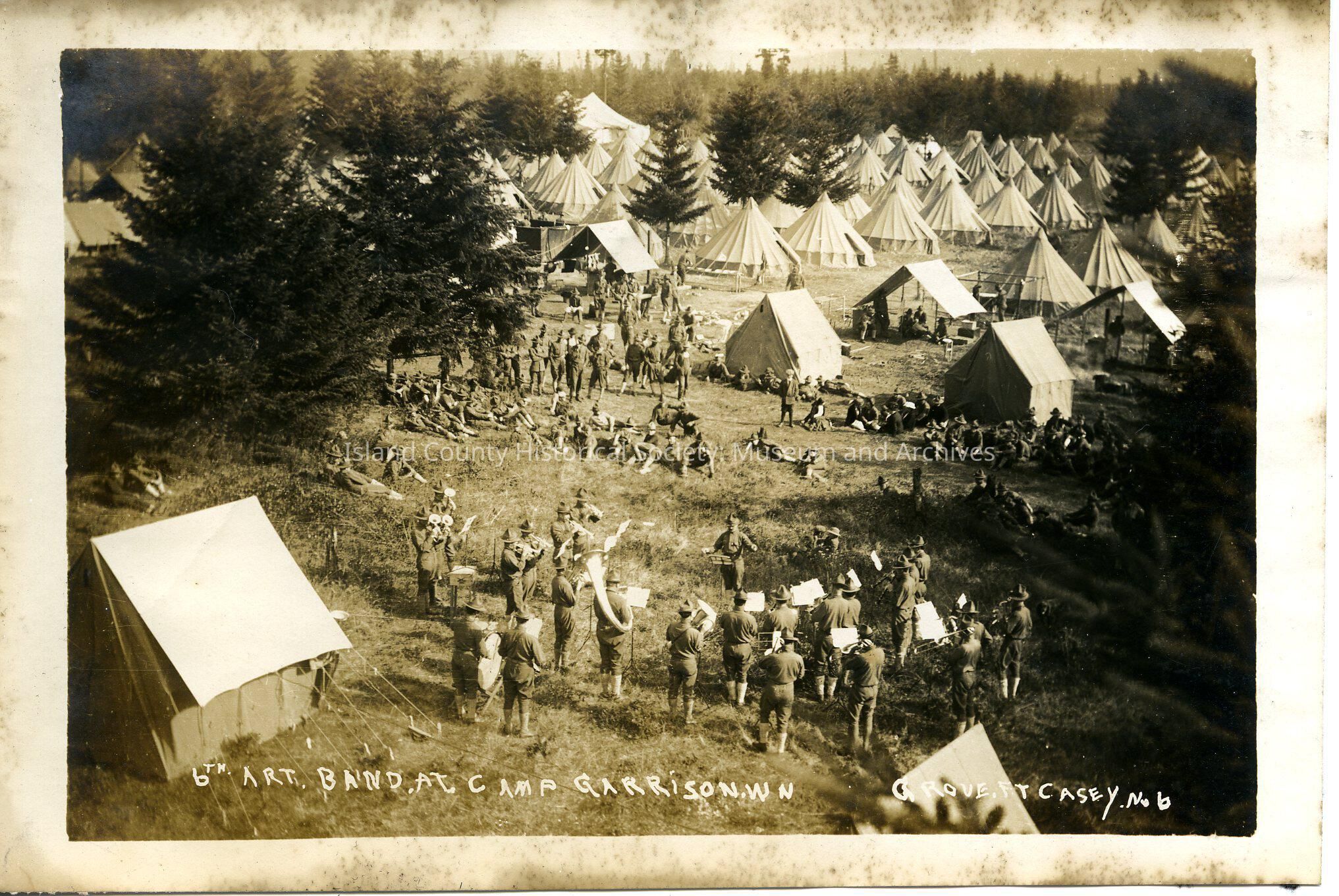 A military encampment with several tents. On the front of the photo it is printed: "6th. ART Band at Camp Garrison WA. Grove, Ft. Casey No 6."