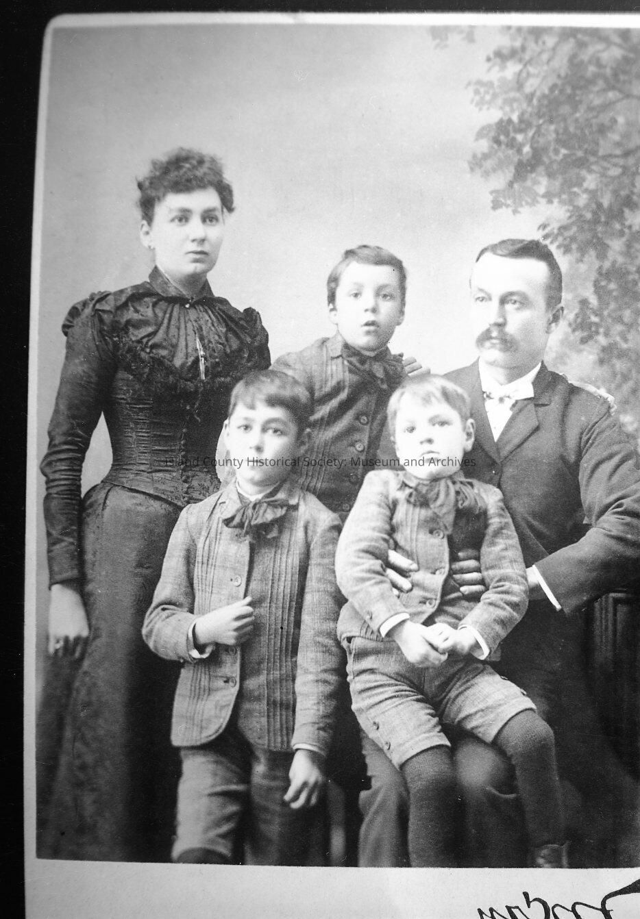 Family portrait of Jacob, Bertha, Arthur, Walter, and Charles Jenne. The boys are all wearing suits and Bertha is wearing a fancy dress.