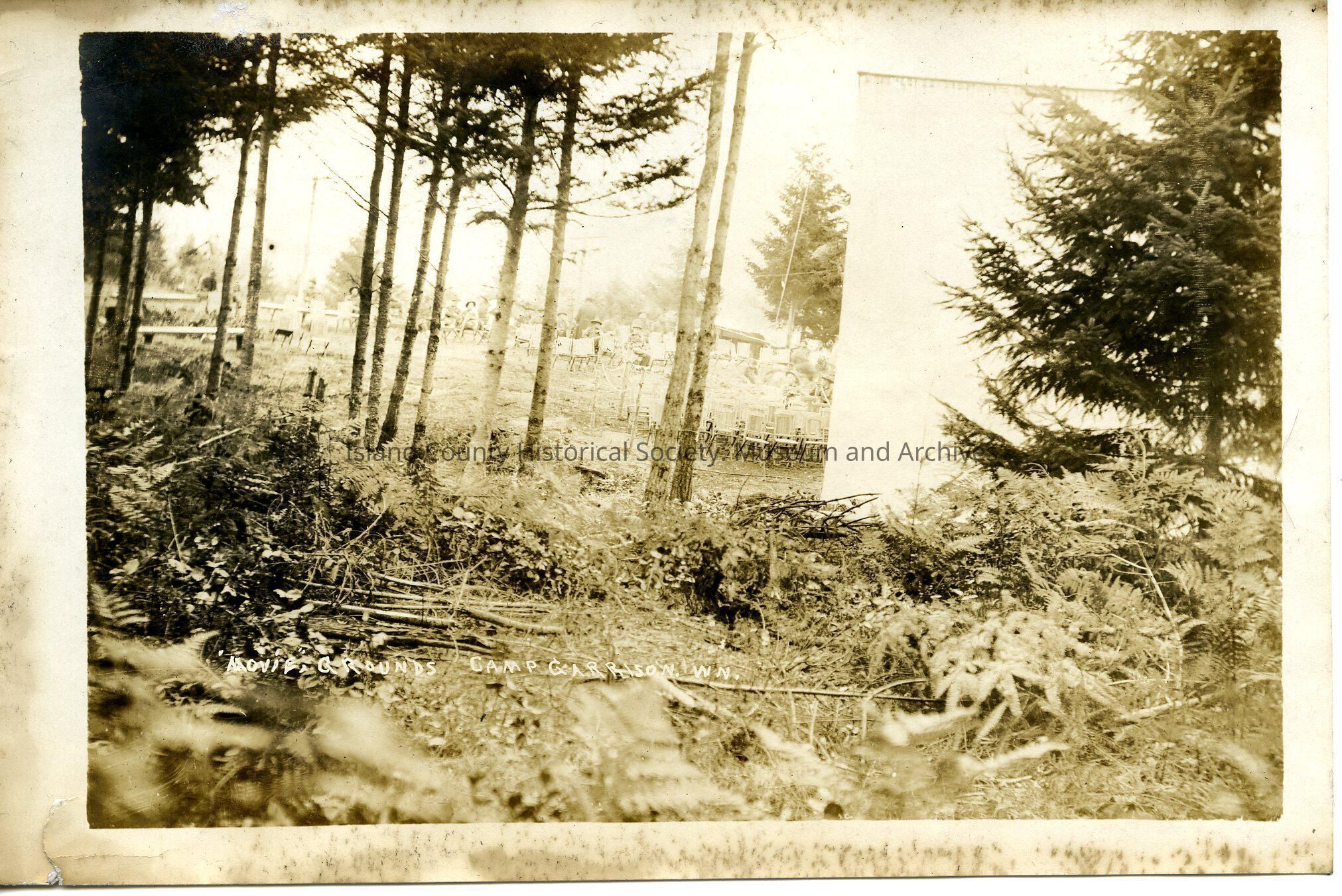 On the front of the photo it states: "Movie Grounds Camp Garrison, WA." An outdoor auditorium with several wooden chairs set up in front of a large white screen. In the background several soldiers are sitting behind empty chairs. Tables and powerlines are in the background.