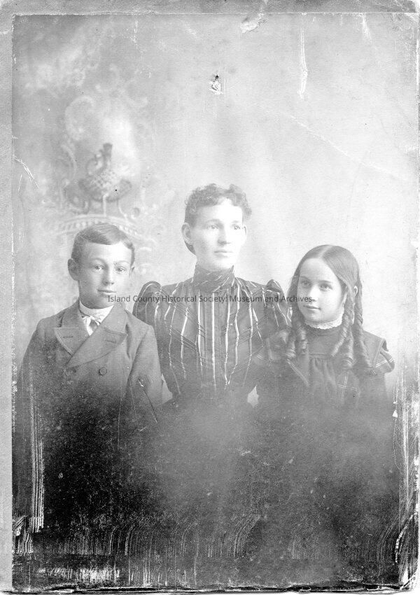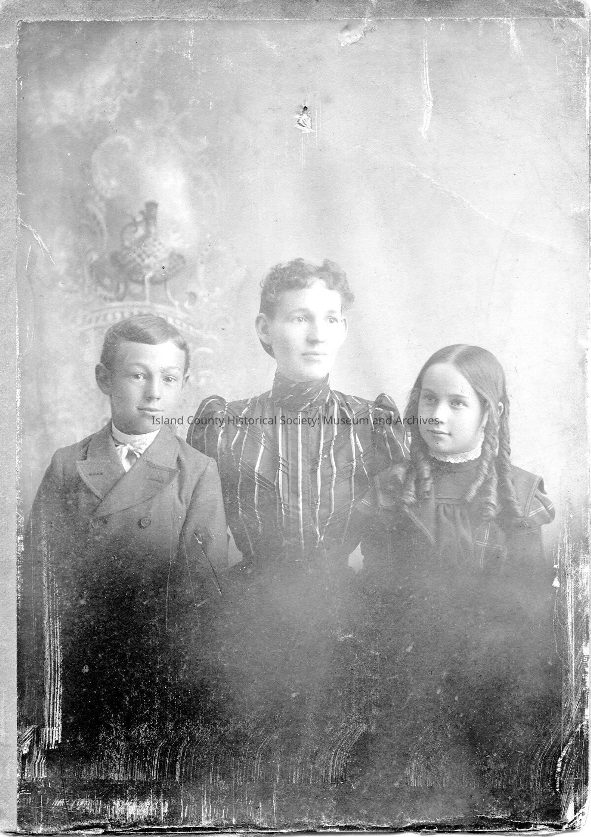 Family portrait of Ed Jenne's family: wiffe Agnes Jenne age 30, Frank Jenne age 11, Edna Jenne age 7. On the back is number 174; the accession book states this is Agnes, Frank and Edna Jenne.