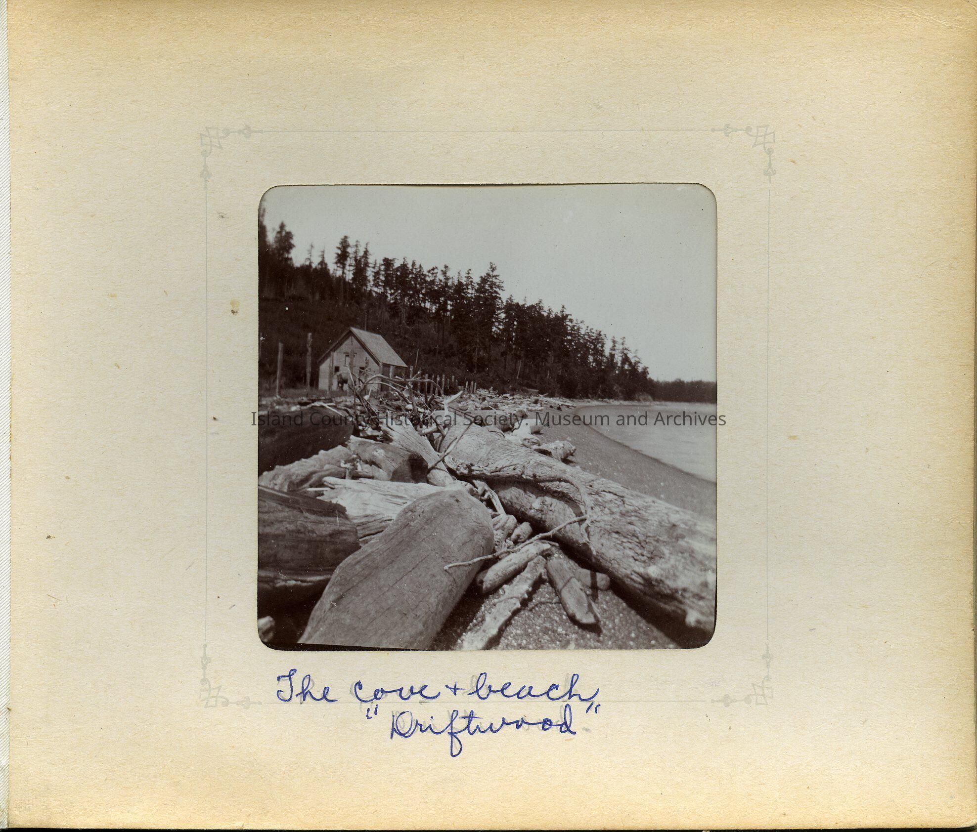 A barn adjacent to a beach. Fenceposts separate farm area from driftwood-covered beach. Note reads: The cove & beach "Driftwood" See 2019.038.021