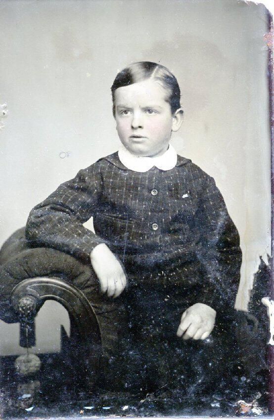 Portrait of a young, unidentified boy seated on a couch, from the Jenne family files.