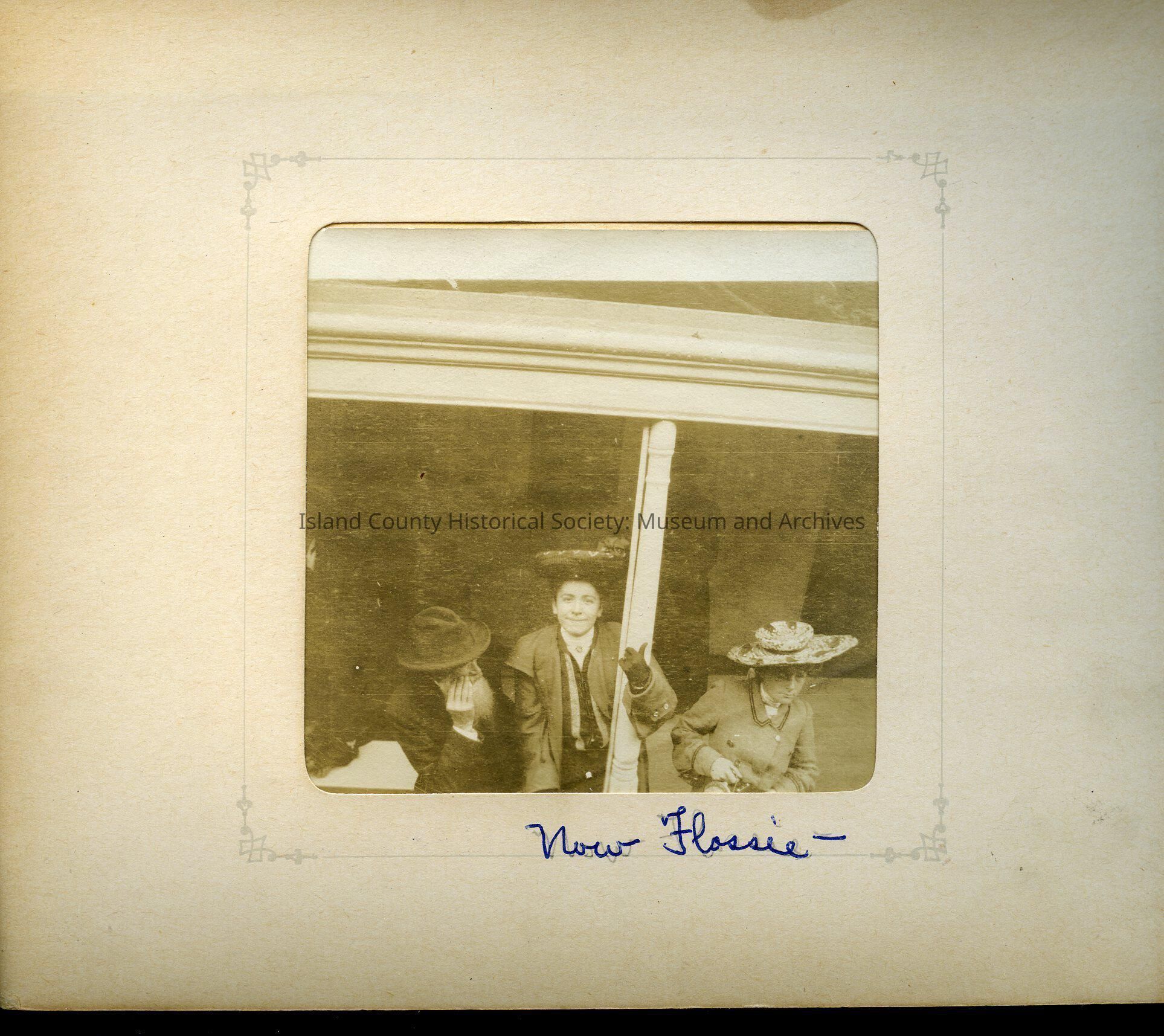 Three people on a porch. Woman in middle holds a post and grins a camera. Woman on right leans and peeks out from under her broad-brimmed hat. A bearded man on left holds his cheek and looks to right. Note reads: Now Flossie -